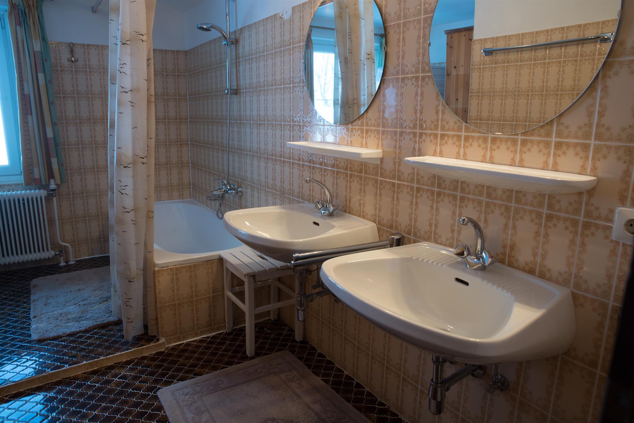 • Großes Badezimmer mit Badewanne und zwei Waschbecken sowie Waschmaschine und Trockner