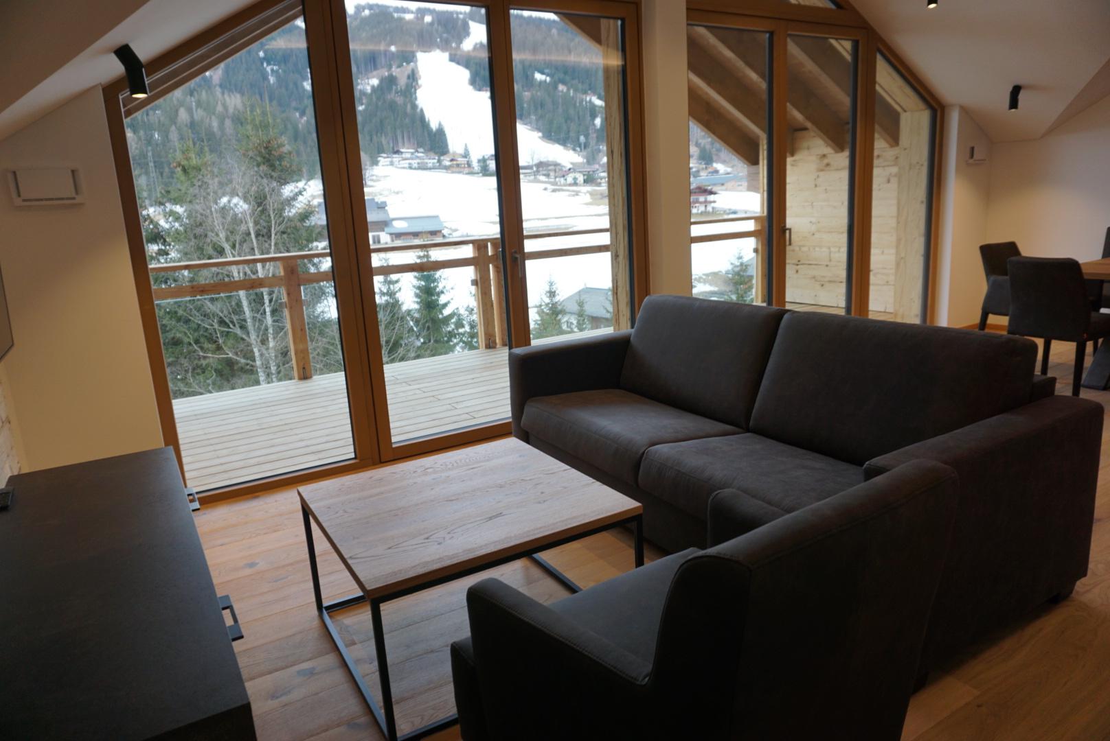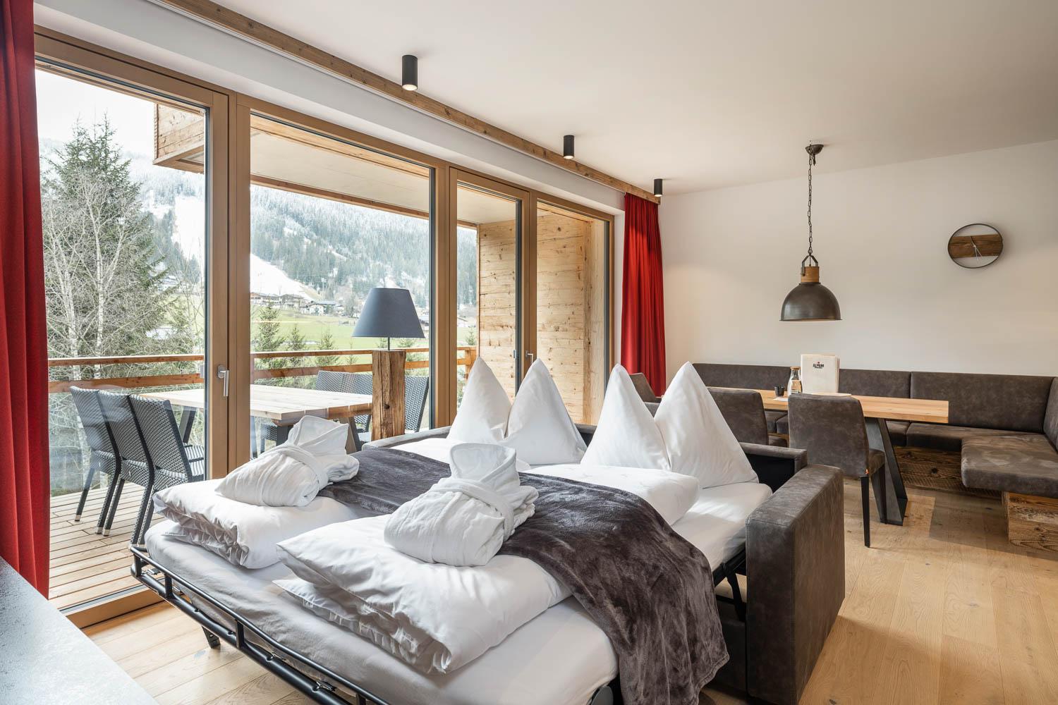 ALPIUM-APPARTEMENTS. ALPIUM ist neu, ALPIUM ist außergewöhnlich - Genießen Sie einen luxuriösen Urlaub in Flachau, im Salzburger Land - Sommer wie Winter. Einkaufsmöglichkeiten, Restaurants & andere Highlights erreichen Sie fußläufig. Die Ski-Busse starten direkt vor der Haustüre. Der Shuttleservice vom/zum Airport Salzburg startet ebenfalls gegenüber. Ein unverbauter Blick vom Balkon auf die Weltmeisterabfahrt und das Panorama erfreuen Sie jeden Tag. Die Skiausrüstung steht sicher im Skiraum in einzelnen Skisafes. Die Tiefgargae ist großzügig dimensioniert und optional gibt´s 3 Ladesäulen für eAutos.