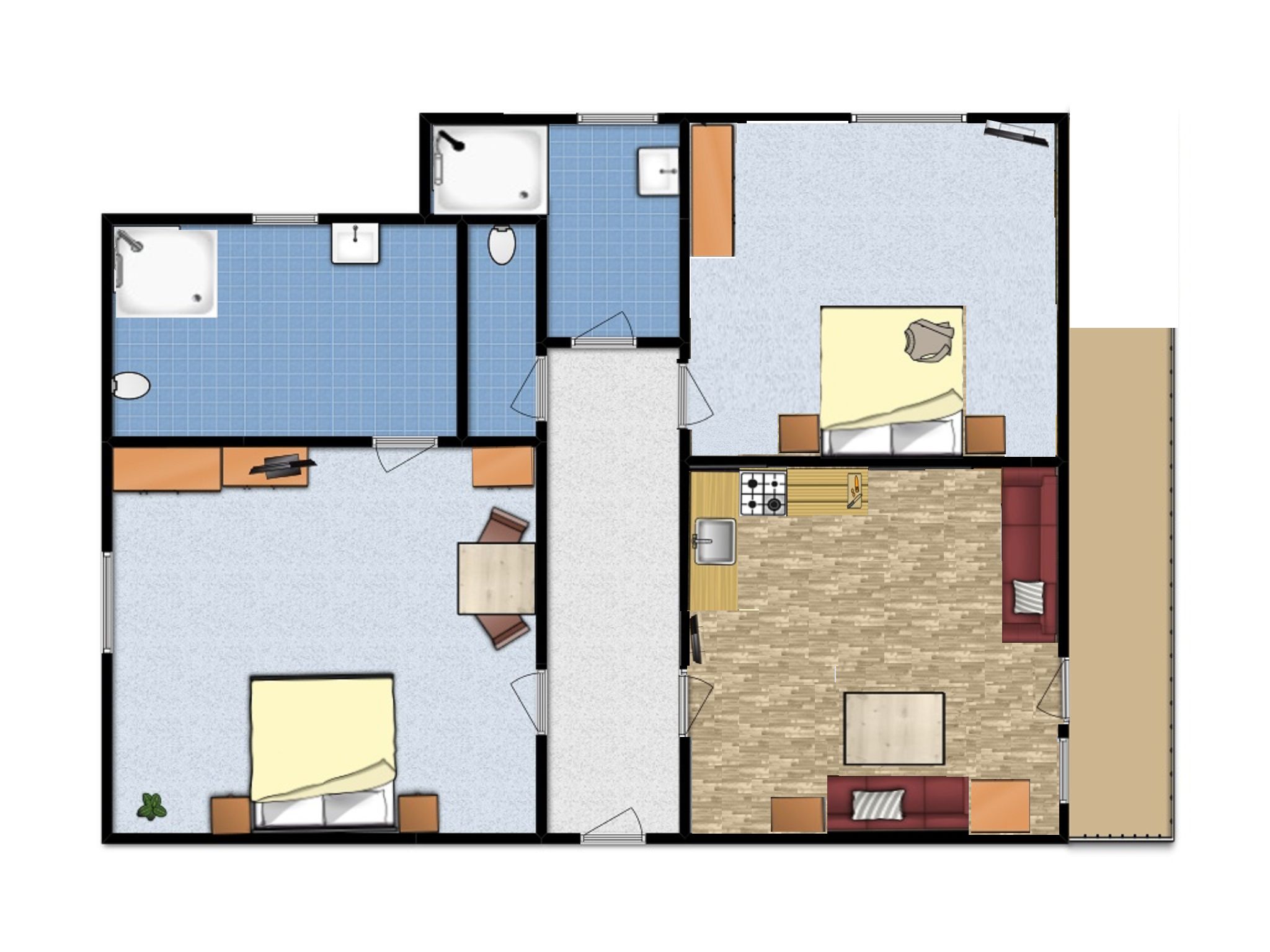 Das Appartement verfügt über: 2 getrennte Schlafzimmer, 2 Badezimmer, Wohnküche mit 4 Plattenherd, Kühlschrank, Kaffeemaschine, Wasserkocher, Mikrowelle und Toaster, Kabel-TV, Safe, Internet, Balkon Ca. 65 m²