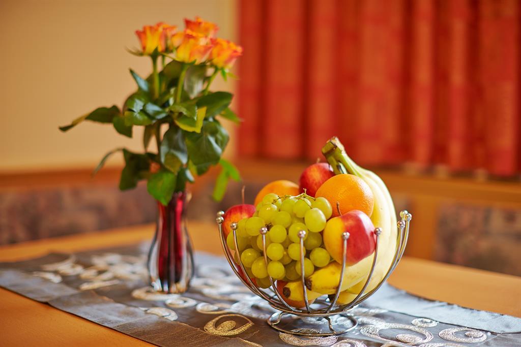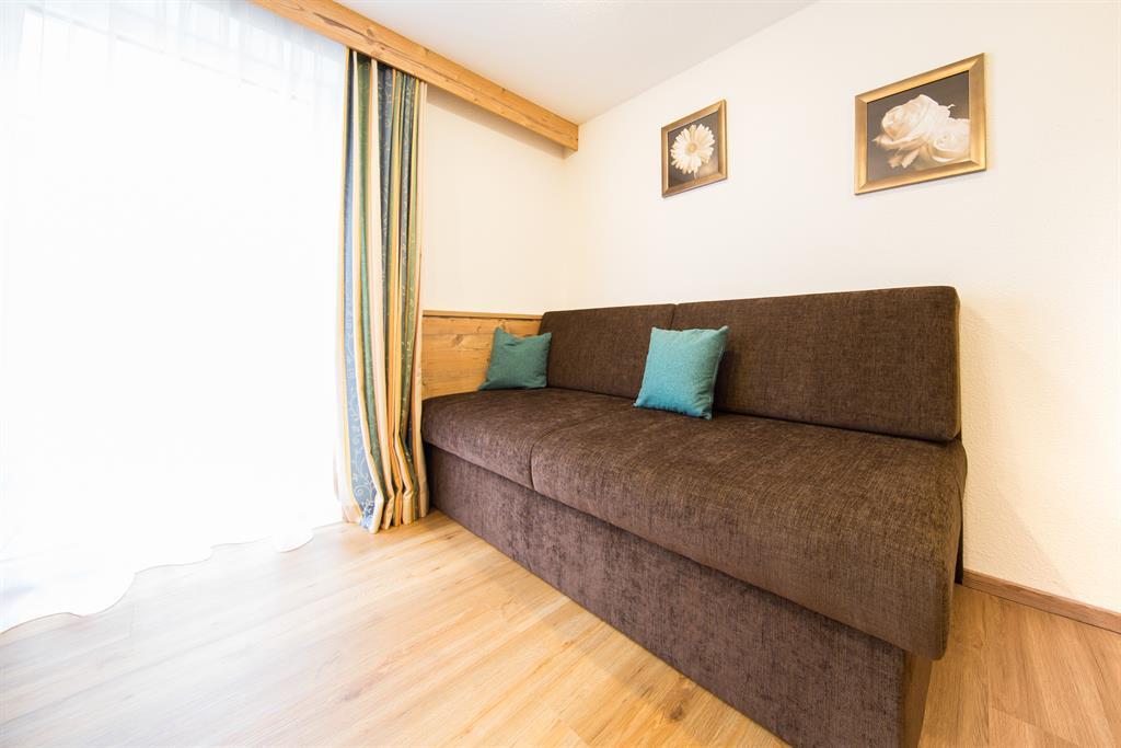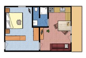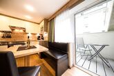 Schlafzimmer, Wohnküche mit Sofa und Essbank mit Esstisch, 4 Plattenherd, Backrohr, Geschirrspüler, Kühlschrank, Kaffeemaschine, Wasserkocher, Mikrowelle und Toaster, Dusche/WC, Kabel-TV, Safe, Internet kostenlos, Balkon(Terrasse) mit Gartenblick (Südseite).Größe ca. 37 m².