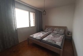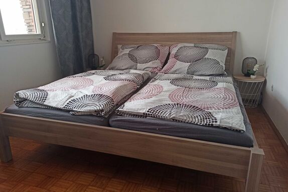 Im Schlafzimmer befindet sich ein großes Doppelbett (180 x 200). Bettwäsche ist vorhanden.