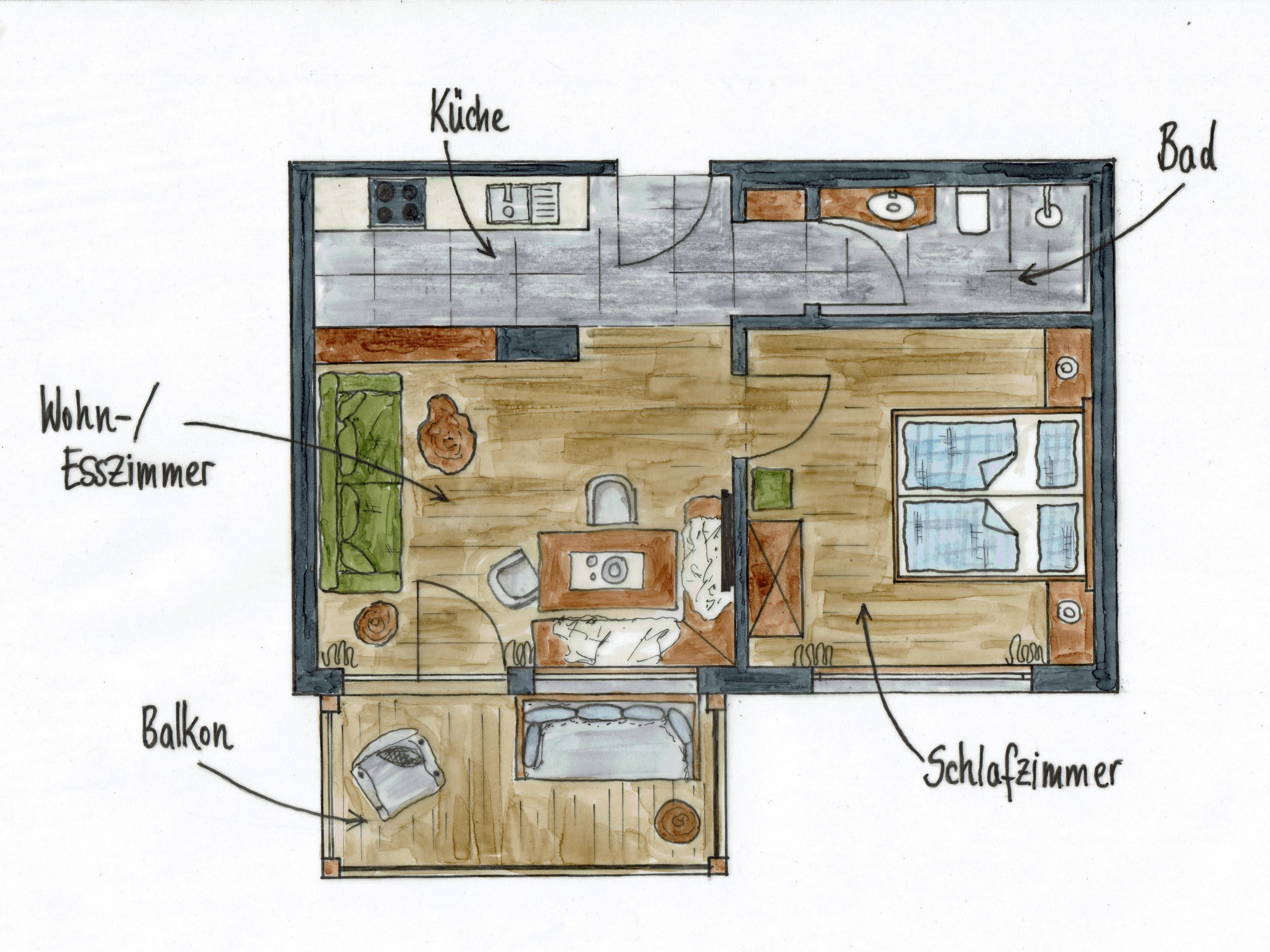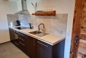 Das 45 qm große 2 Zimmer Appartement befindet sich im 1. Obergeschoss des Hauses. Die stilvolle und rustikale Ausstattung beinhaltet ein Doppelbett im Schlafzimmer und eine komfortable Schlafcouch für 2 Personen im Wohn-/Essbereich. Bei Bedarf sind ein Beistellbett für Kinder, ein Babybett und Hochstuhl verfügbar.
