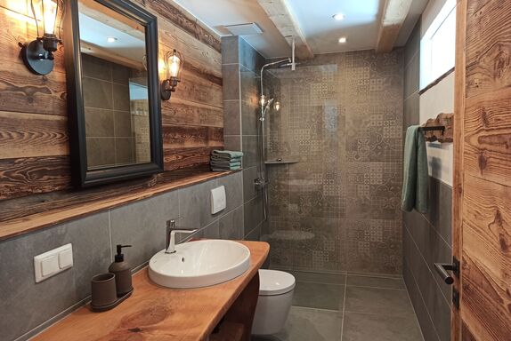 Das Badezimmer ist mit einem ebenerdigen Duschbereich ausgestattet und verfügt über Fußbodenheizung. Handtücher und Föhn stehen den Gästen frei zur Verfügung.