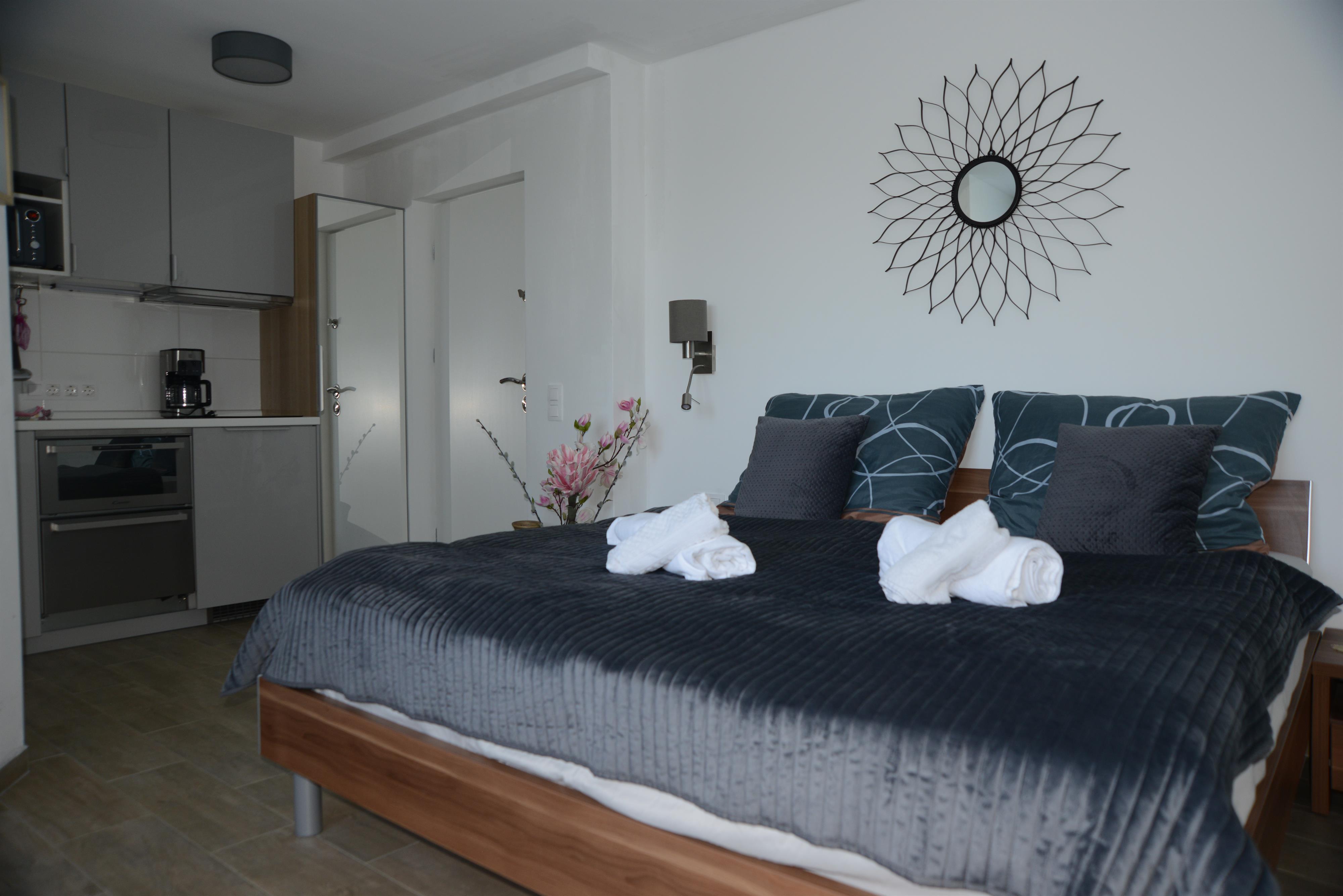 Dieses Appartement ist neu entstanden . Im Zimmer befindet sich eine kleine Küchenzeile. Im Zimmerpreis ist aber das Frühstück enthalten. Vor dem Haus ist für die Studiogäste eine kleine Überdachte Terrasse. Das Zimmer ist 16,5m² groß und die Terrasse ist 6,5m².
