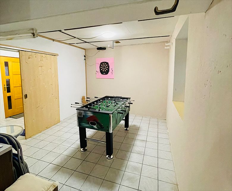Im kühlen Erdgeschoss steht ihnen ein Spielezimmer mit Tischfußball, Dart und Wii zur Verfügung, ebenso können sie dort die zweite große Garderobe und den Schuhtrockner nutzen.