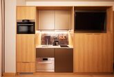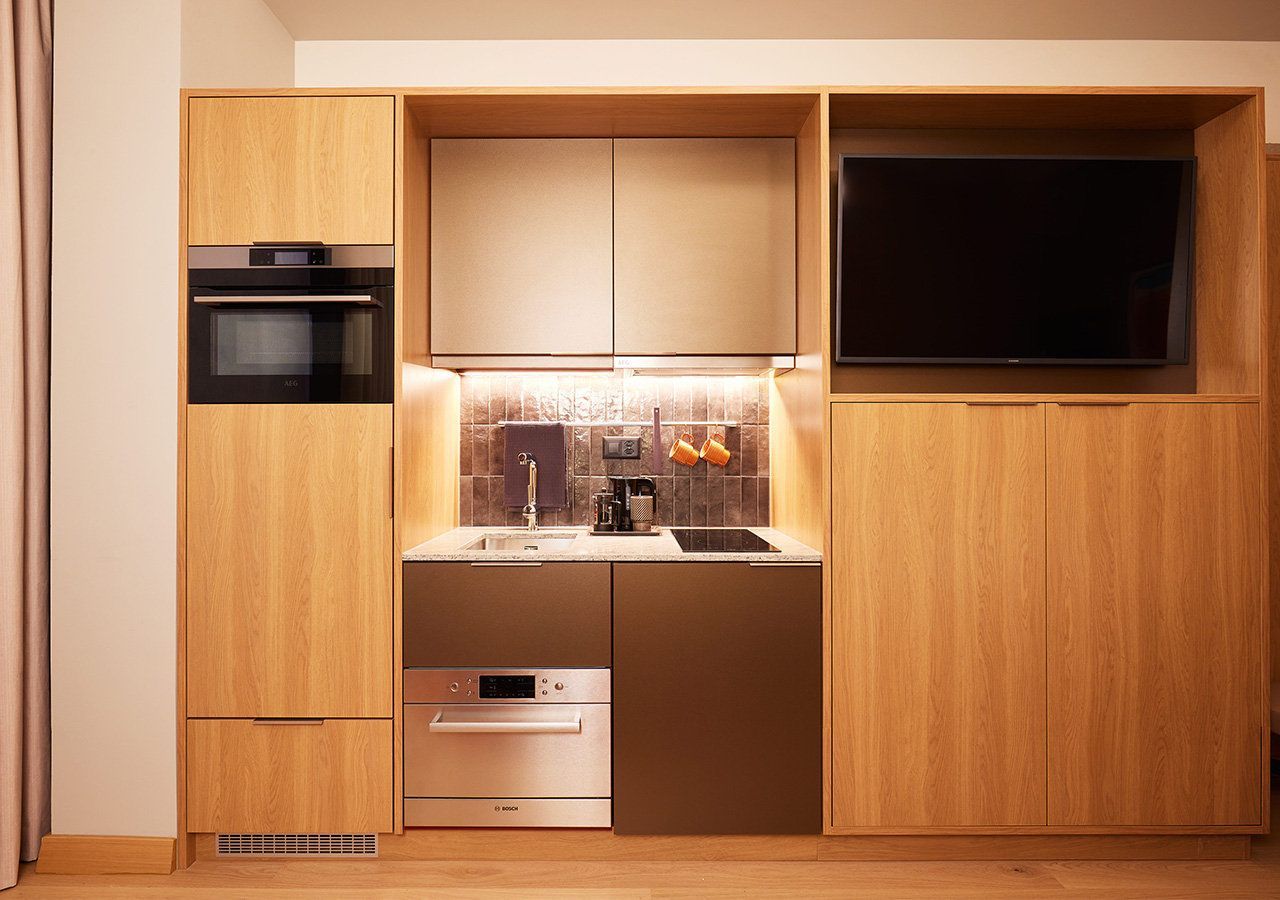 Alle Zimmer sind ausgestattet mit einer eigenen Küche, einem Wohn- und Arbeitsbereich, sowie einem Waschtrockner und Bügelbrett & -eisen.