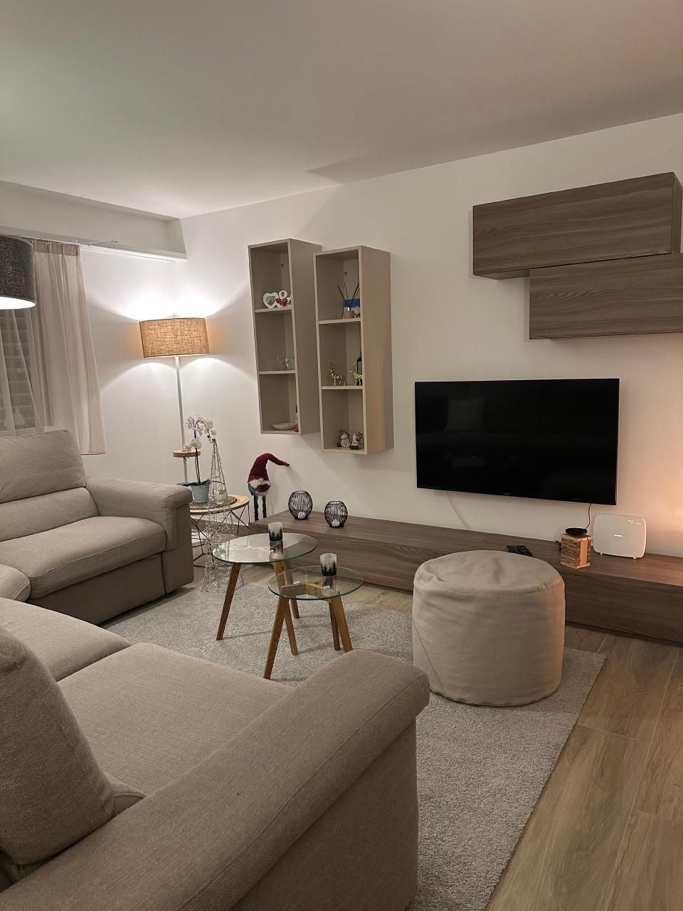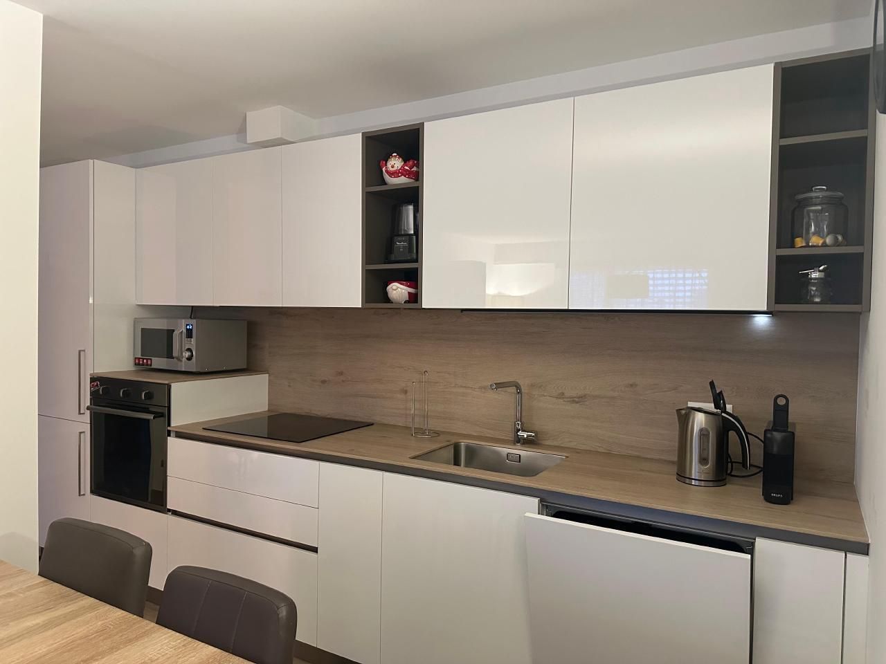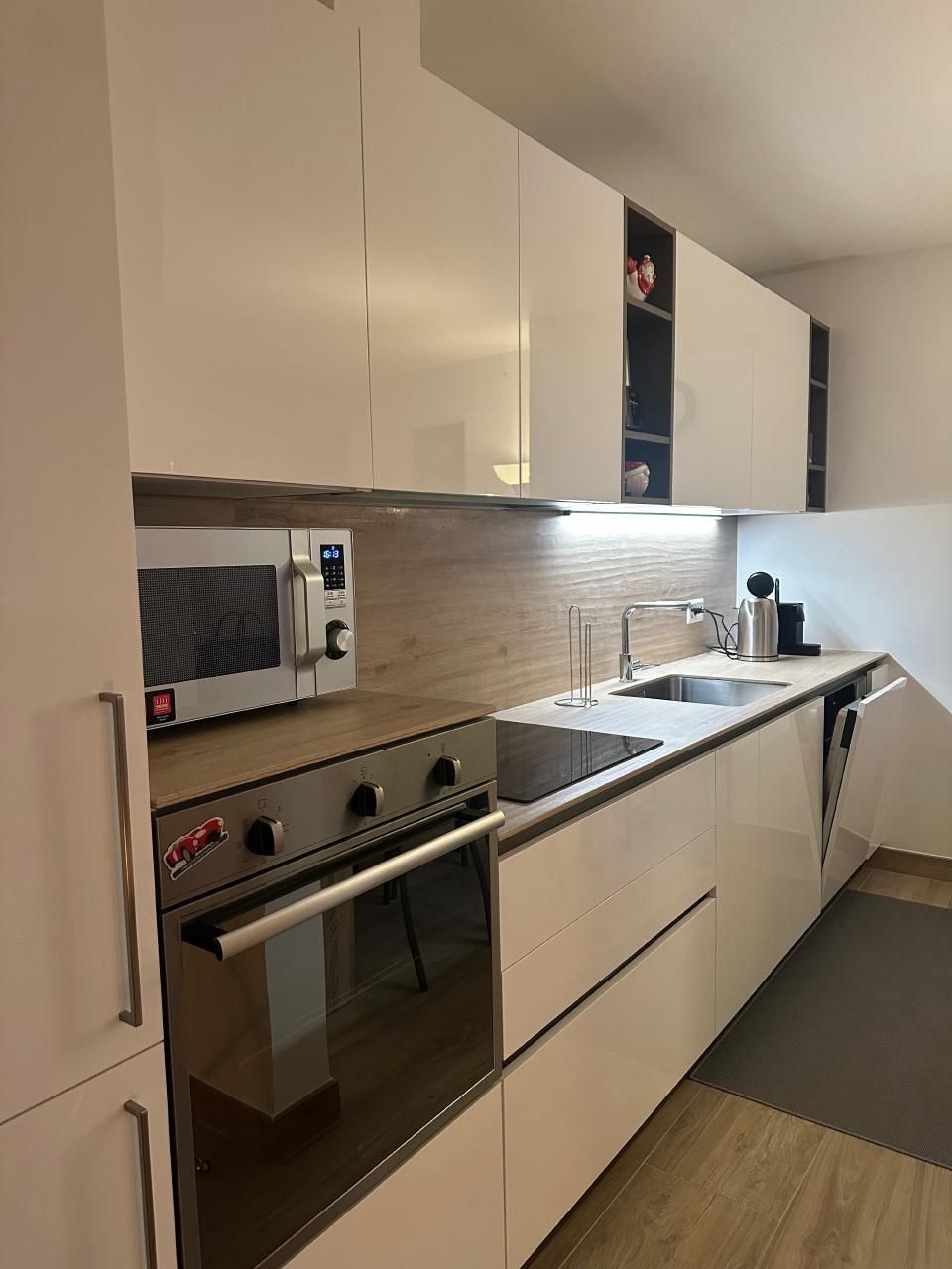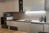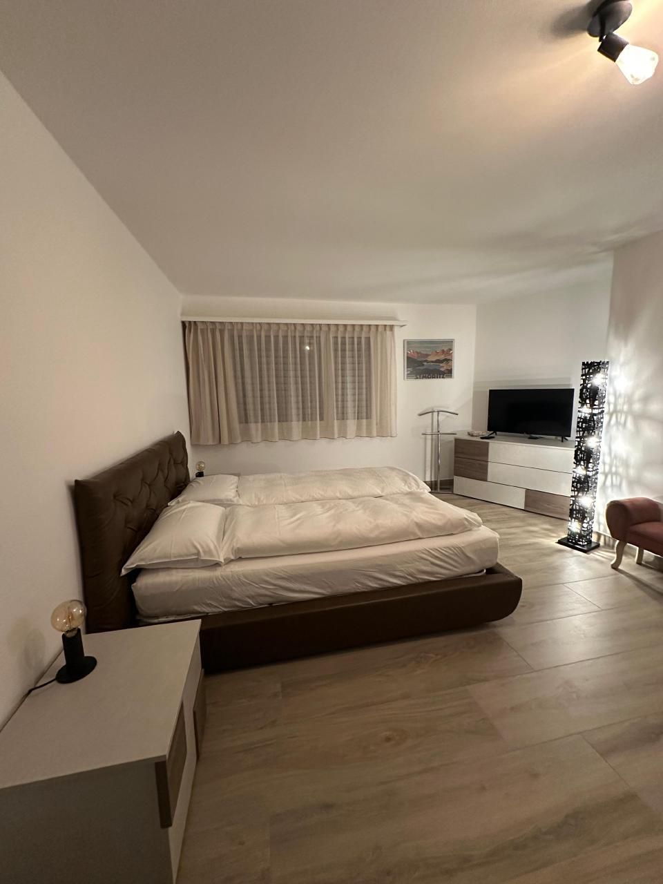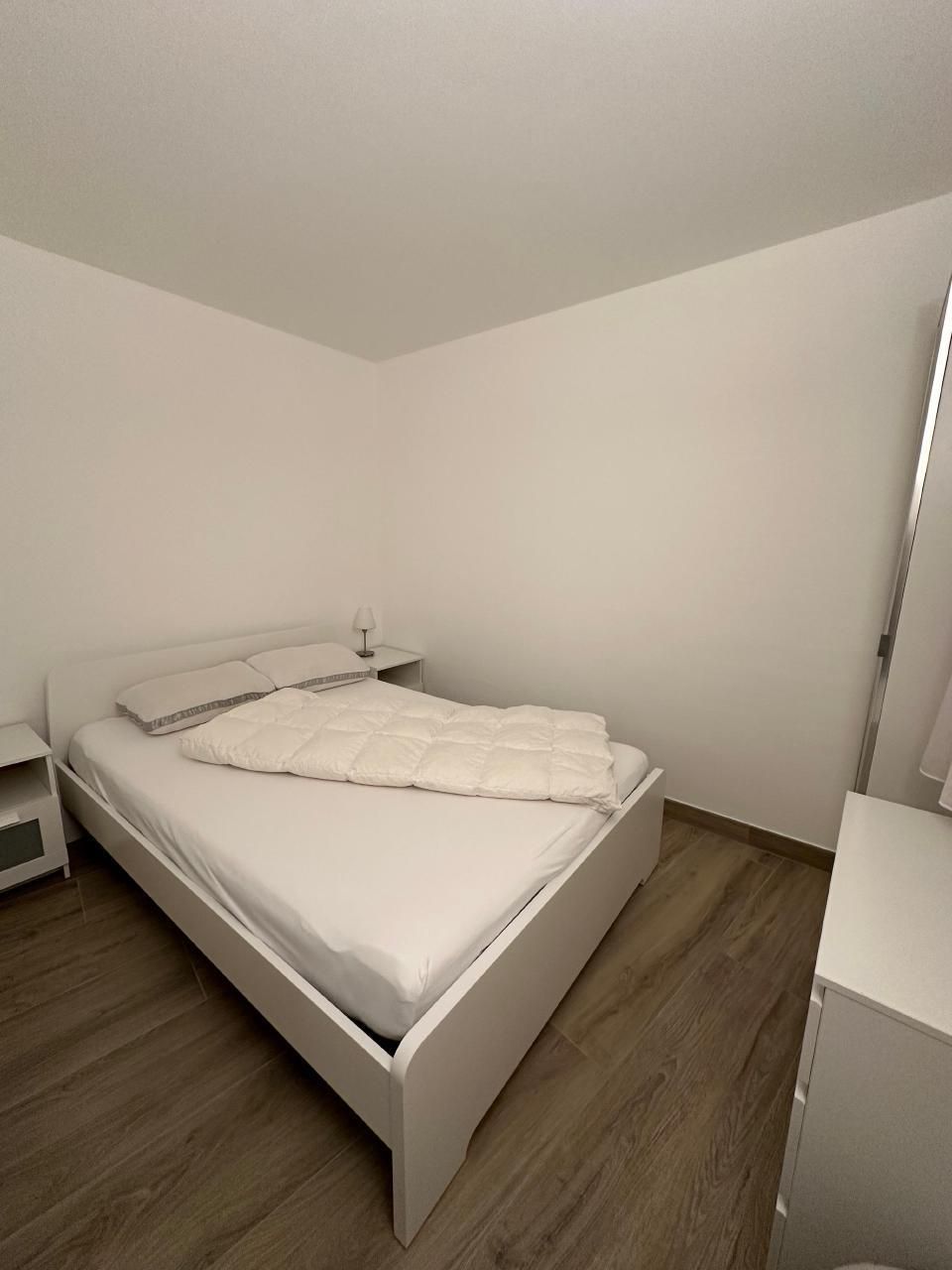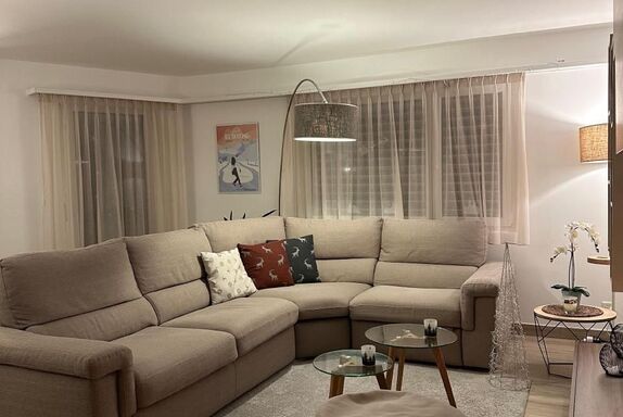 Im Inneren zeichnet sich die Wohnung durch ihre geräumige Aufteilung aus, die zwei Schlafzimmer umfasst: ein Hauptschlafzimmer mit einem Kingsize-Bett, einem viertürigen Kleiderschrank und einer Kommode und ein zweites Schlafzimmer mit einem 140x200 großen Bett, einem Kleiderschrank und einer Kommode. Ein Badezimmer mit geräumiger Dusche und regulierbarer Fußbodenheizung sowie ein Wohnzimmer, das mit einem Wandfernseher mit Sunrise TV-Box ausgestattet ist, machen das Ambiente noch gemütlicher und sorgen für angenehme Momente der Entspannung. Die offene Küche ist mit den neuesten Geräten ausgestattet, darunter eine Mikrowelle, ein Wasserkocher, eine Nespresso-Kaffeemaschine, ein Toaster und ein Mixer, die zur Zubereitung köstlicher Mahlzeiten einladen.