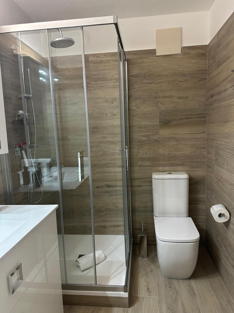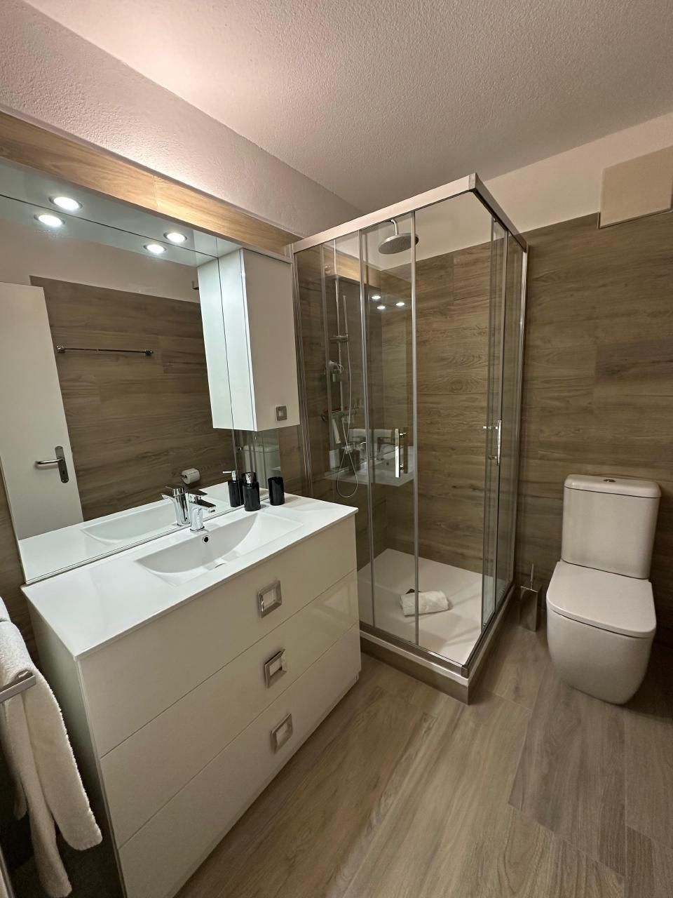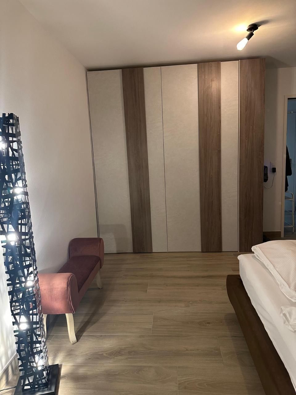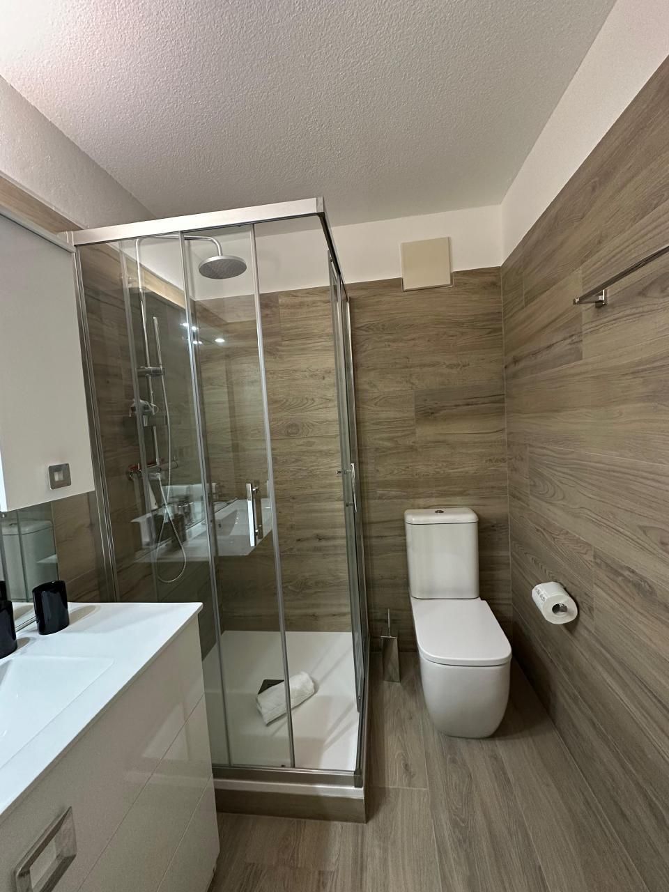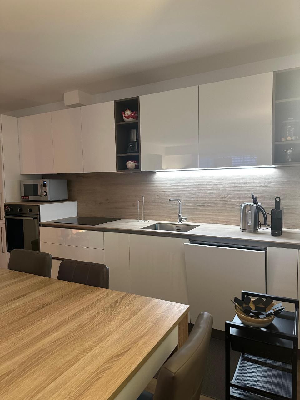Im Inneren zeichnet sich die Wohnung durch ihre geräumige Aufteilung aus, die zwei Schlafzimmer umfasst: ein Hauptschlafzimmer mit einem Kingsize-Bett, einem viertürigen Kleiderschrank und einer Kommode und ein zweites Schlafzimmer mit einem 140x200 großen Bett, einem Kleiderschrank und einer Kommode. Ein Badezimmer mit geräumiger Dusche und regulierbarer Fußbodenheizung sowie ein Wohnzimmer, das mit einem Wandfernseher mit Sunrise TV-Box ausgestattet ist, machen das Ambiente noch gemütlicher und sorgen für angenehme Momente der Entspannung. Die offene Küche ist mit den neuesten Geräten ausgestattet, darunter eine Mikrowelle, ein Wasserkocher, eine Nespresso-Kaffeemaschine, ein Toaster und ein Mixer, die zur Zubereitung köstlicher Mahlzeiten einladen.