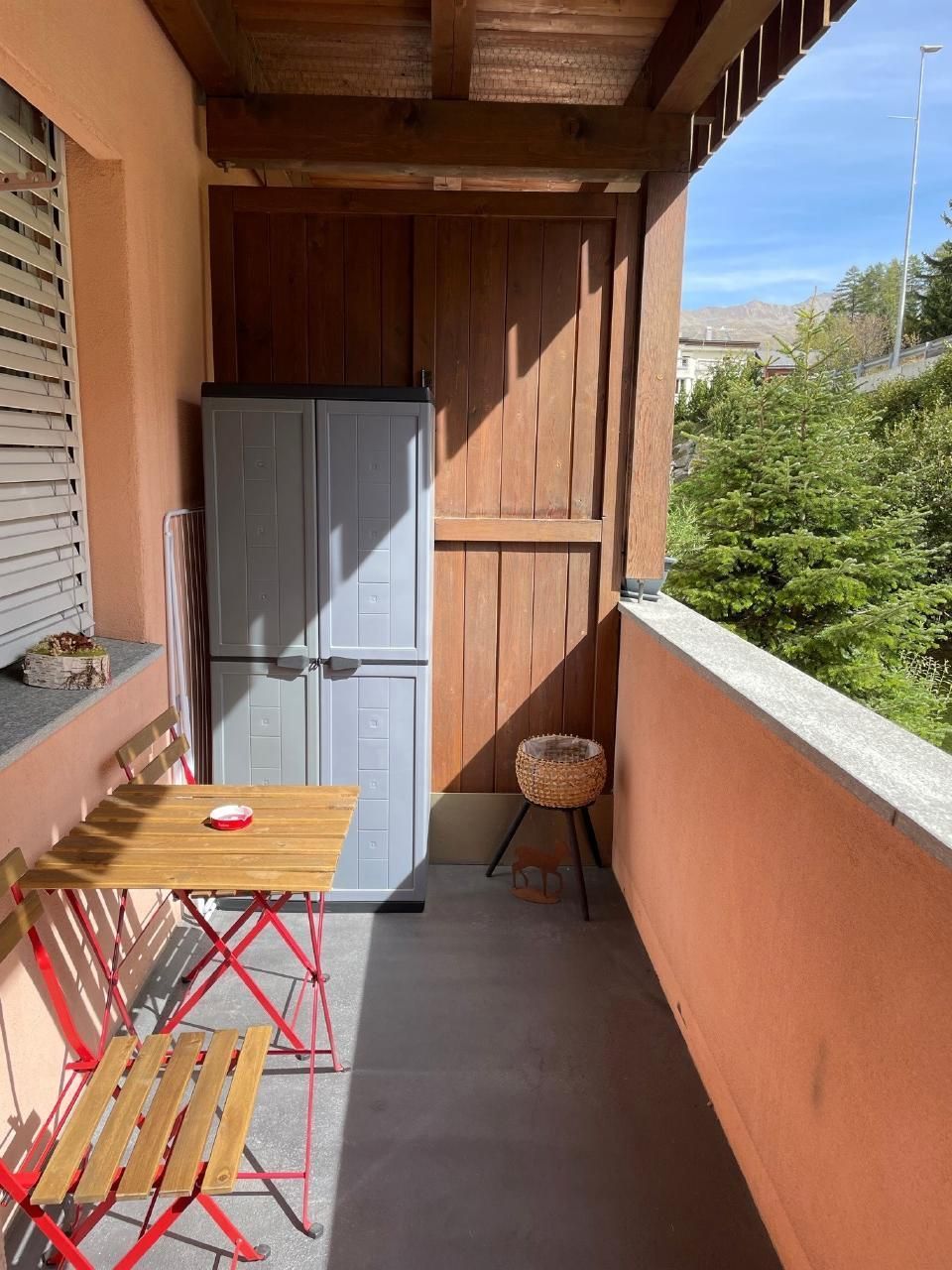 Genießen Sie den Außenbereich der Wohnung auf dem Balkon, der vom Wohnzimmer aus zugänglich ist und mit einem Tisch und Stühlen ausgestattet ist, um die Aussicht zu genießen. Die Wohnung verfügt außerdem über einen privaten Parkplatz im Freien und Gemeinschaftseinrichtungen wie Waschküche, Skiraum und Fahrradraum.