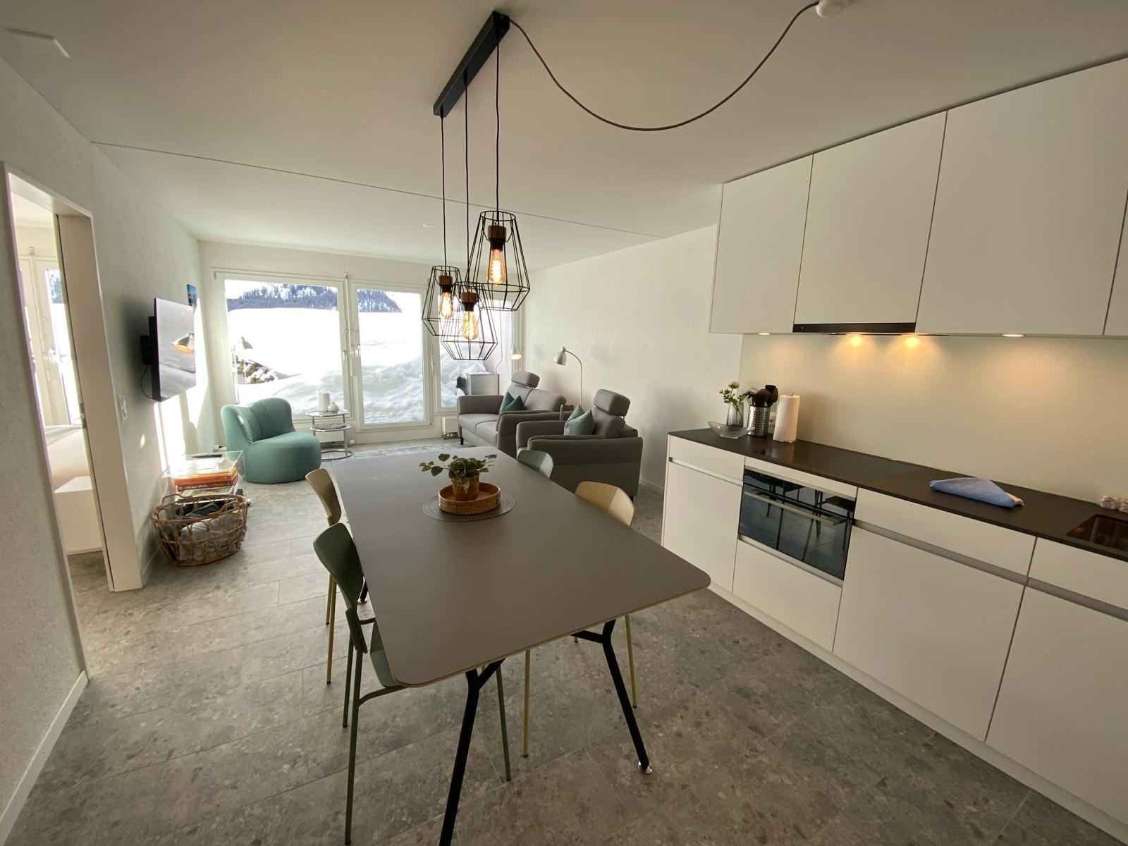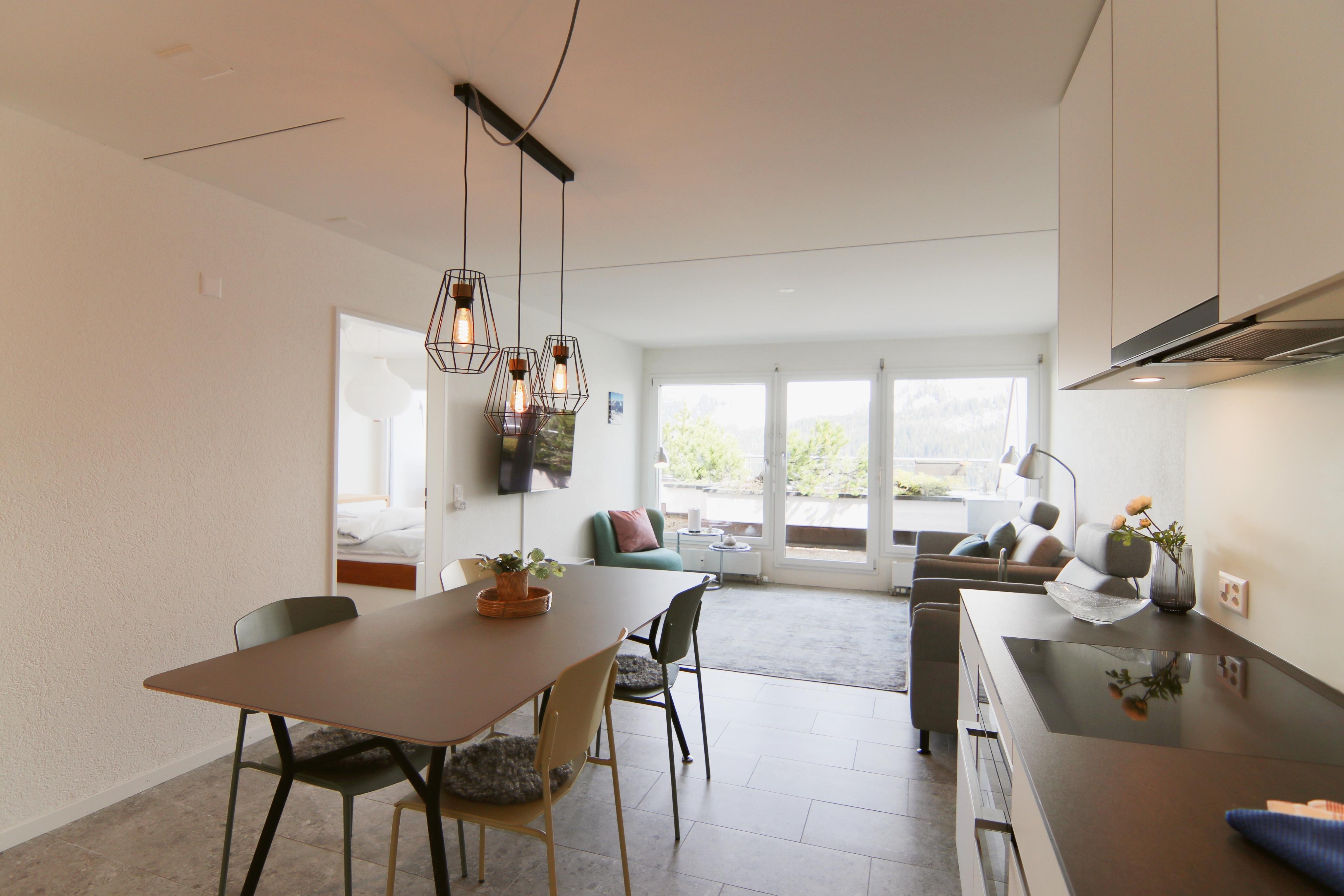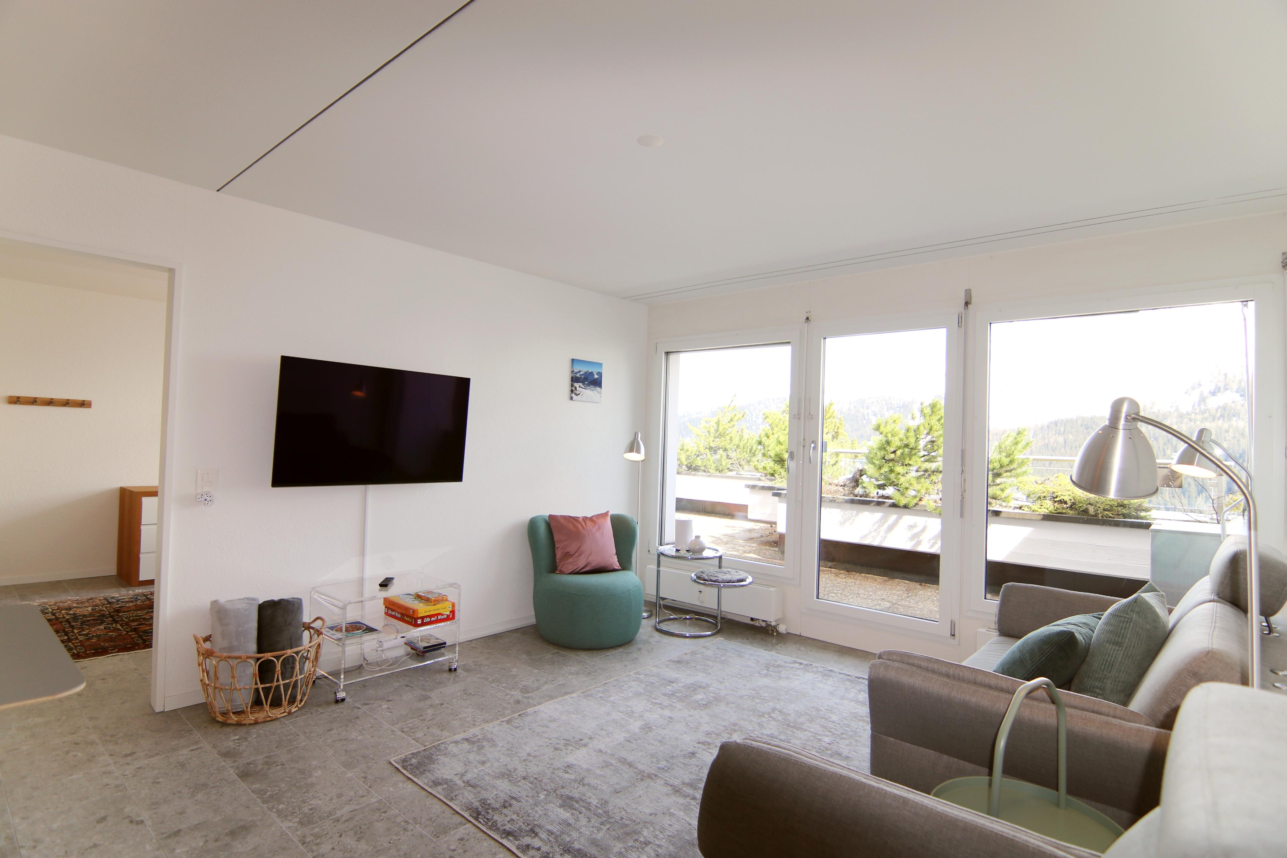 Die helle 2-Zimmer-Wohnung befindet sich im 5. Stock eines Wohngebäudes, in welchem auch der Coop Supermarkt liegt. Der herrliche Bergblick kann vom grossen Balkon aus genossen werden. Die nächste Bushaltestelle liegt unmittelbar vor der Haustüre, durch die zentrale Lage direkt an der Poststrasse erreicht man alle Bergbahnen bequem mit dem Bus.
