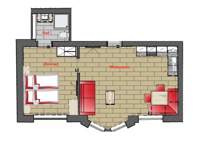 Appartement mit Balkon, ca. 40 m²: voll ausgestattete Wohnküche mit Cerankochfeld und Backrohr, Mikrowelle, Geschirrspüler, Kaffeemaschine, gemütlichem Essecke, Kabel TV und großem Wohnbreich mit ausziehbarem Sofa (Schlafgelegenheit für 2 Personen), 1 Doppelzimmer mit großen Kleiderschrank, 1 Badezimmer mit Dusche/WC und Haarföhn.