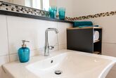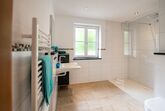 • Badezimmer mit WC, Waschtisch und ebenerdiger Dusche