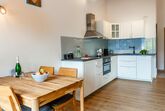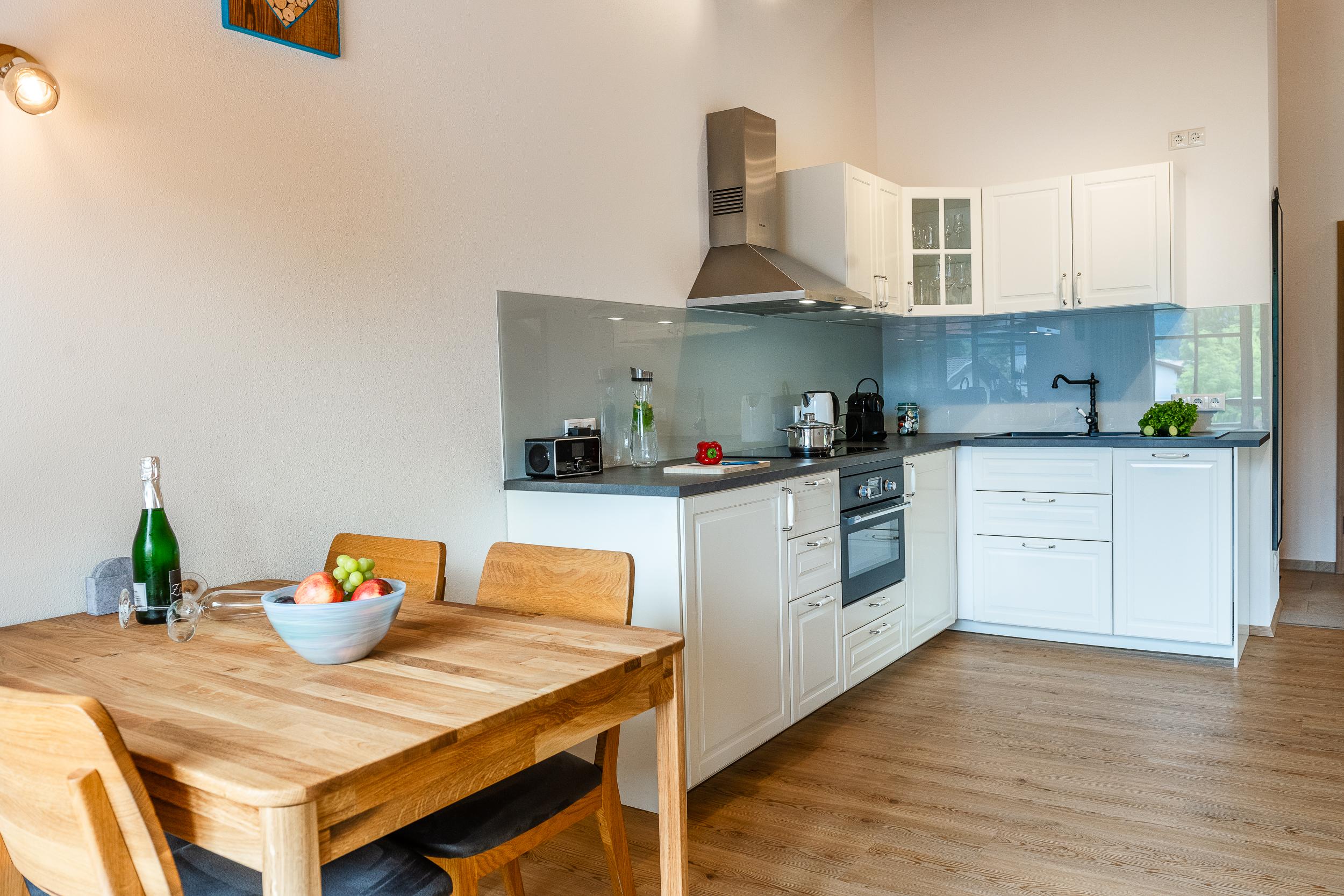 • großer Wohn-Essbereich mit moderner Küche, Essplatz, TV und gemütlichem Sofa