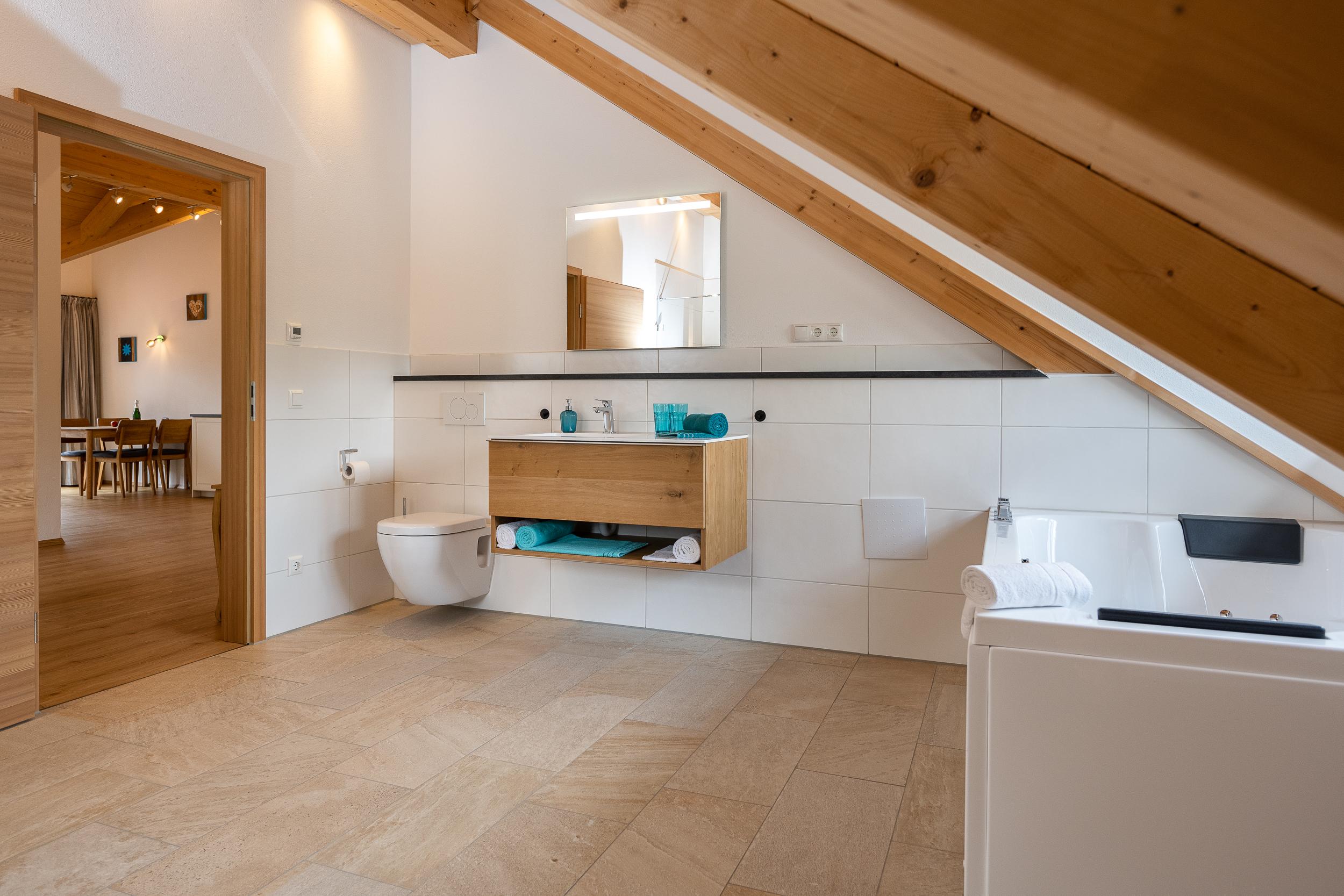 • Badezimmer mit WC, Waschtisch, ebenerdiger Dusche und Whirl-Wanne mit Panoramablick für 2 Personen