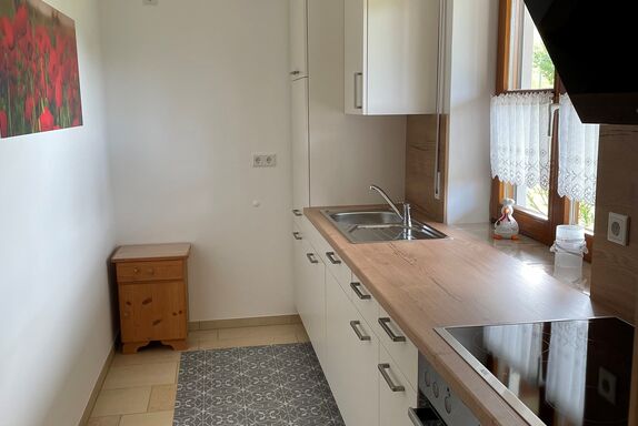 Separater, ebenerdiger Eingang mit eigener Haustüre, 2 Schlafzimmer mit Fenster und Doppelbetten, Wohnzimmer mit einer großen gemütlichen Couch, einer separaten Küche mit Geschirrspüler, Kühlschrank mit Gefrierfach, Mikrowelle, Kaffeemaschine, Wasserkocher, Toaster und reichlich Geschirr. Zudem finden Sie eine großzügig gestaltete Essecke vor. Das Badezimmer mit Fenster verfügt über eine Badewanne mit Duschabtrennung, Waschbecken, WC. Von der möblierten und überdachten Terrasse haben Sie einen wundervollen Ausblick in den großen Garten mit Grillmöglichkeit und Sonnenliegen. Große abschließbarer Garage für PKW und Fahrräder. Bettwäsche und Handtücher inklusive.