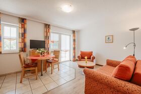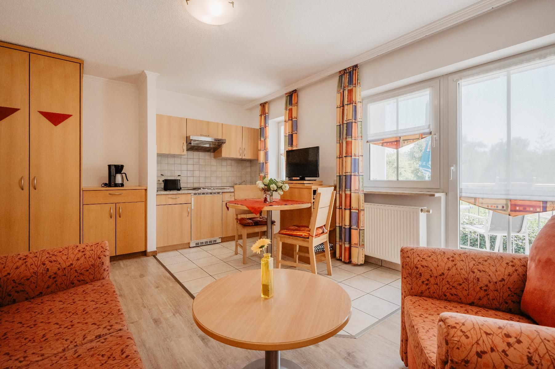 Wohnküche mit gemütlicher Sitzgruppe bzw. Schlafcouch. Kostenloses W-LAN und Flachbild- /