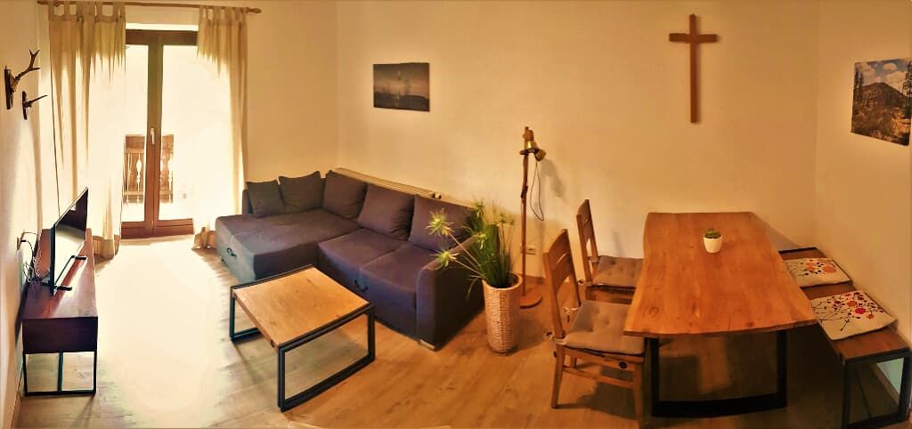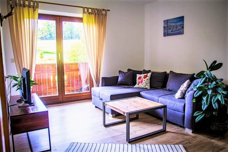 Das helle Wohnzimmer mit großem gemütlichen Sofa, Flachbild-TV und Zugang zum Südbalkon lädt zum Verweilen ein.