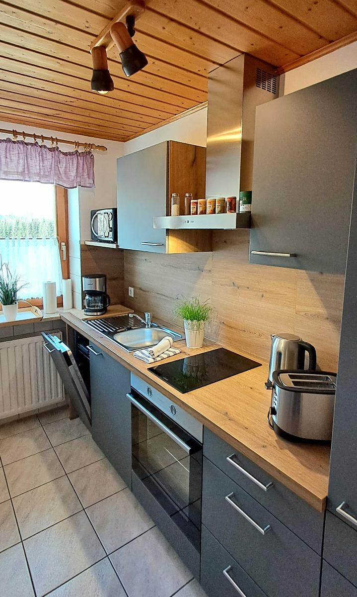 Die komplett ausgestattete Küche mit Kühlschrank inkl. Gefrierfach, Herd mit 2 Ceranfelder, Backofen, Geschirrspülmaschine Mikrowelle, Dunstabzug, Wasserkocher, Toaster und Kaffeemaschine lässt keine Wünsche offen.