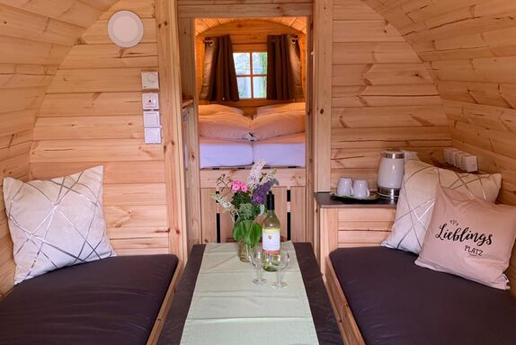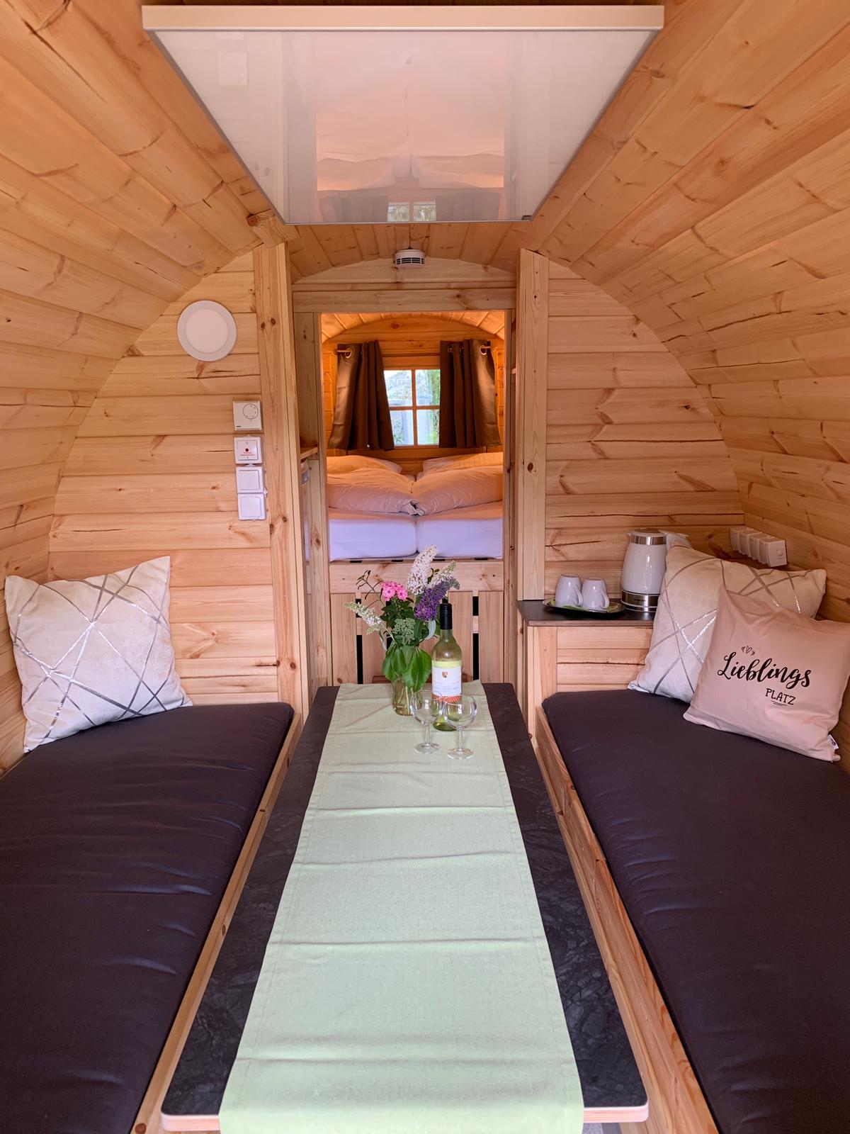 Die Fässer sind für maximal 4 Personen ausgestattet. Es gibt im hinteren Bereich ein großes Doppelbett für 2 Personen. Die Sitzbänke im vorderen Bereich laden zum gemütlichen Verweilen ein oder können auch als weitere Schlafplätze für die Kinder genutzt werden. Schlafen Sie dort mit Ihren eigenen Schlafsäcken oder Ihrer mitgebrachten Bettwäsche. Die Matratzen sind bereits mit Spannbettlaken bezogen.