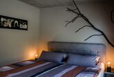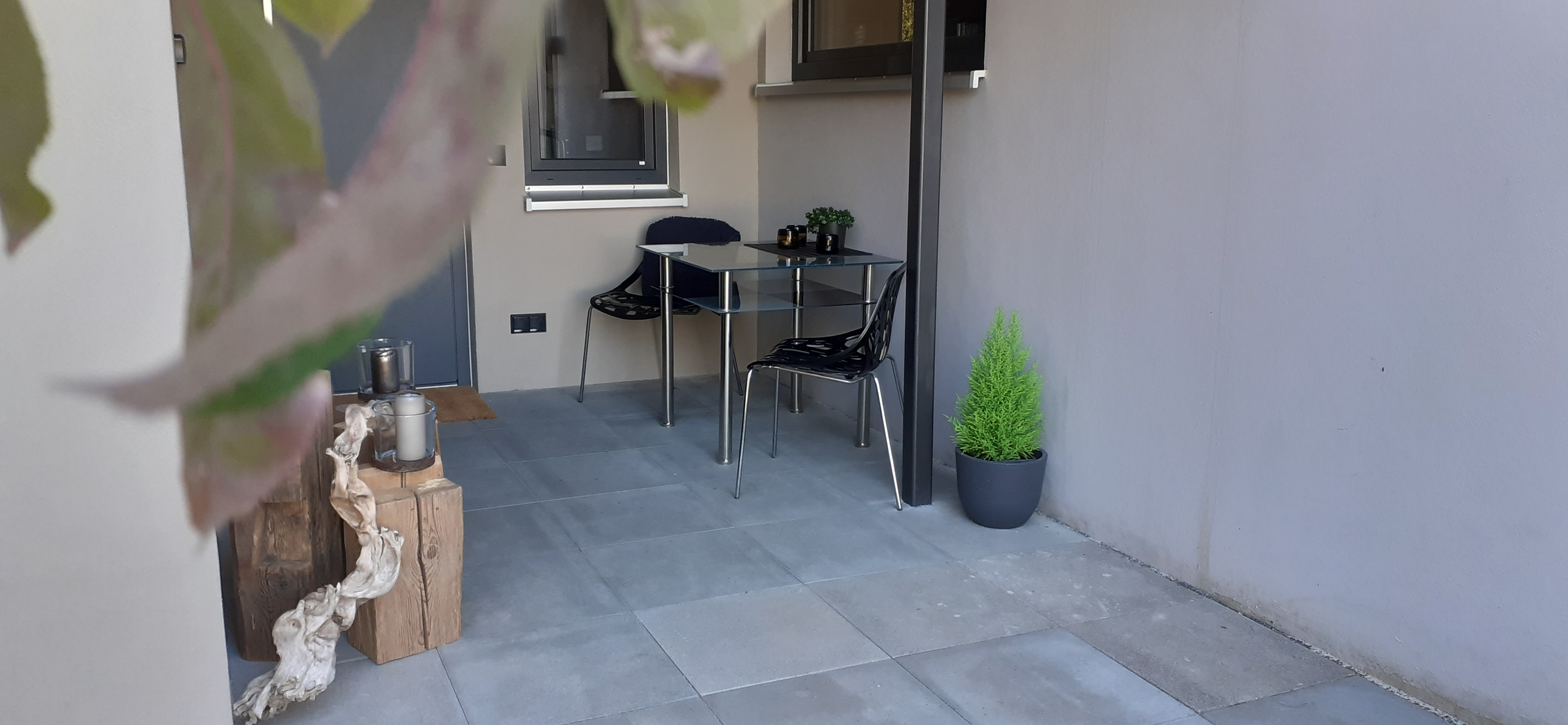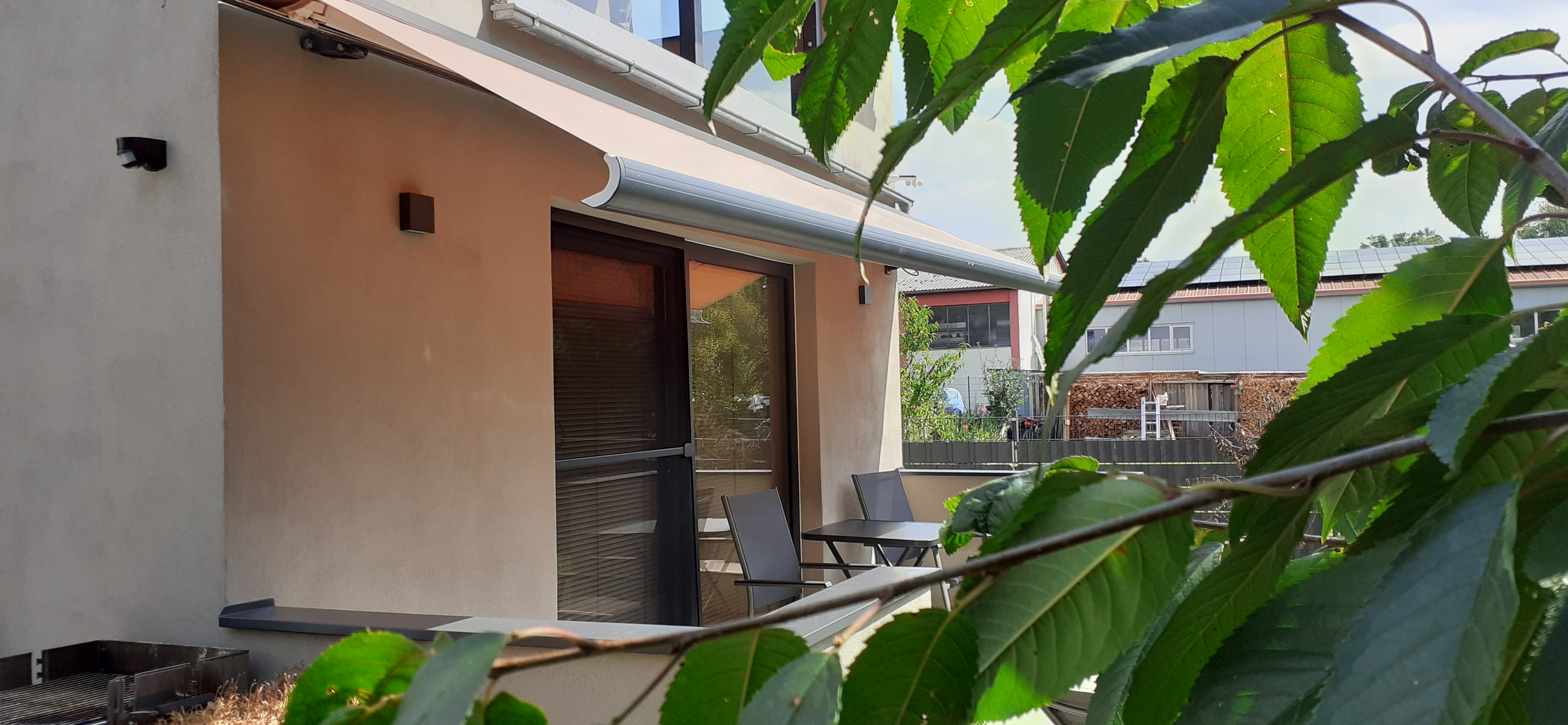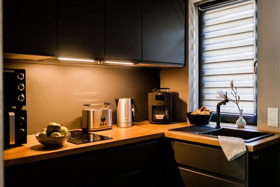 Unsere Wohnung im oberen Bereich hat eine Wohnfläche von ca. 35 m² und bietet Platz für 1 - 3 Personen oder 2 Erwachsene und 2 Kinder. Das gemütliche Wohnzimmer mit Eichenechtholzparkett, Schlafsofa und schwenkbarem Flachbild-TV lädt zum Verweilen ein. Die komplett ausgestattete Küche mit Kühlschrank inkl. Gefrierfach, kleinem Backofen, Herd, Mikrowelle, Wasserkocher, Toaster und Kaffeeautomaten lässt keine Wünsche offen. Das Ferienhaus verfügt über einem kombinierten Wohn- und Schlafbereich und ist mit einem großen Boxspringbett und dem Zugang zur Terrasse mit kleinem Garten und wunderbarem Ausblick auf die Natur. Die Betten sind bezogen und Handtücher sind vorhanden. Die sonnige Terrasse ist mit einer elektrischen Sonnenmarkise mit romantischem Licht und zusätzlich einer Sonnenliege ausgestattet. Der Garten kann genutzt werden und auf Nachfrage kann auch ein kleines Lagerfeuer für Naturfreunde angeheizt werden. Ein Grill für lecker Gegrilltes ist auch vorhanden.