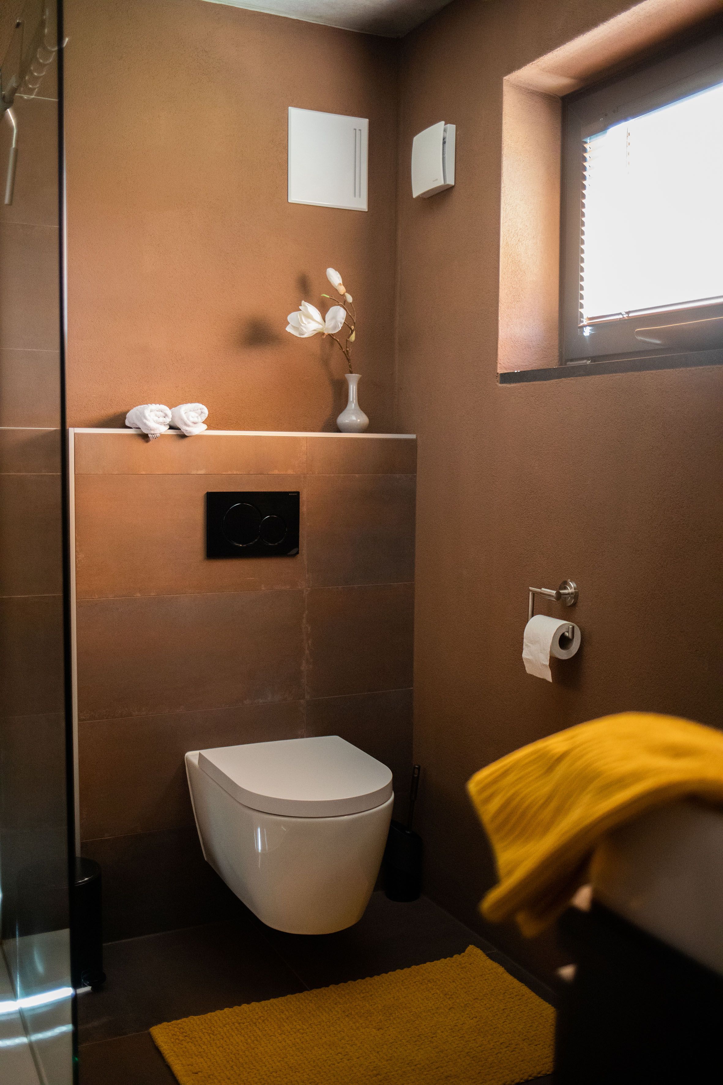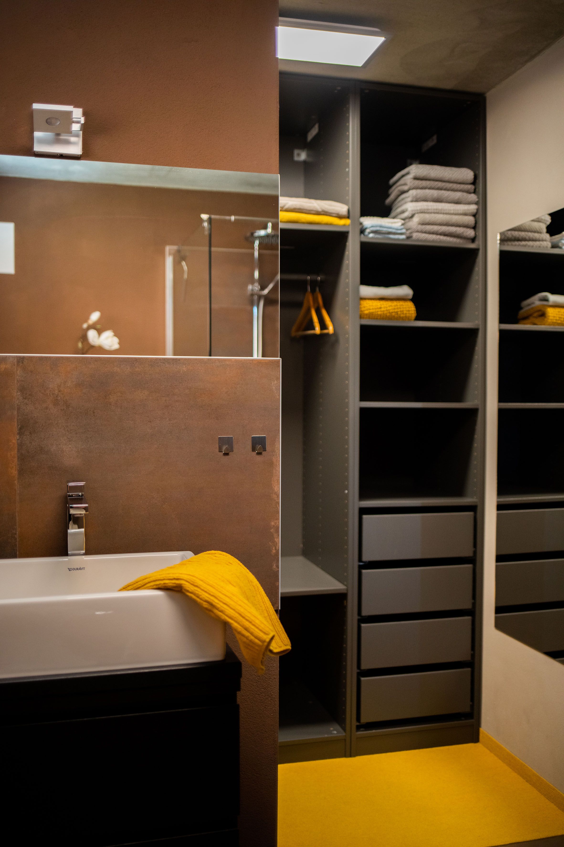 Das geräumige Badezimmer mit ebenerdiger Dusche, großem Spiegel, Fön, beleuchtetem Vergrößerungsspiegel und WC ausgestattet. Hier befindet sich auch ein Ankleideraum mit geräumigen Schrank und Teppichboden.