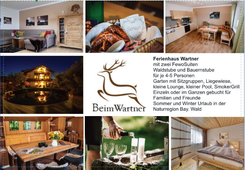 Unsere Ferienwohnungen Bauernstube und Waldstube im Ferienhaus Wartner sind sehr großzügig gestaltet und neu möbliert. Nicht nur für Familien, sondern auch für Paare, die sich eine Auszeit gönnen und die niederbayerische Gastfreundschaft im Urlaub genießen. Hier ist auch ein Garten mit kleinem Pool ( Sommer ), Terrasse, Smoker Grill - Sitzecke für diese zwei Wohnungen.