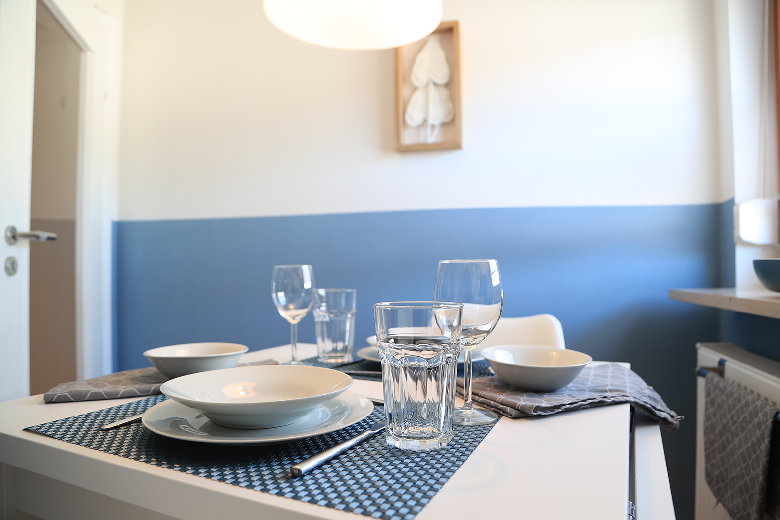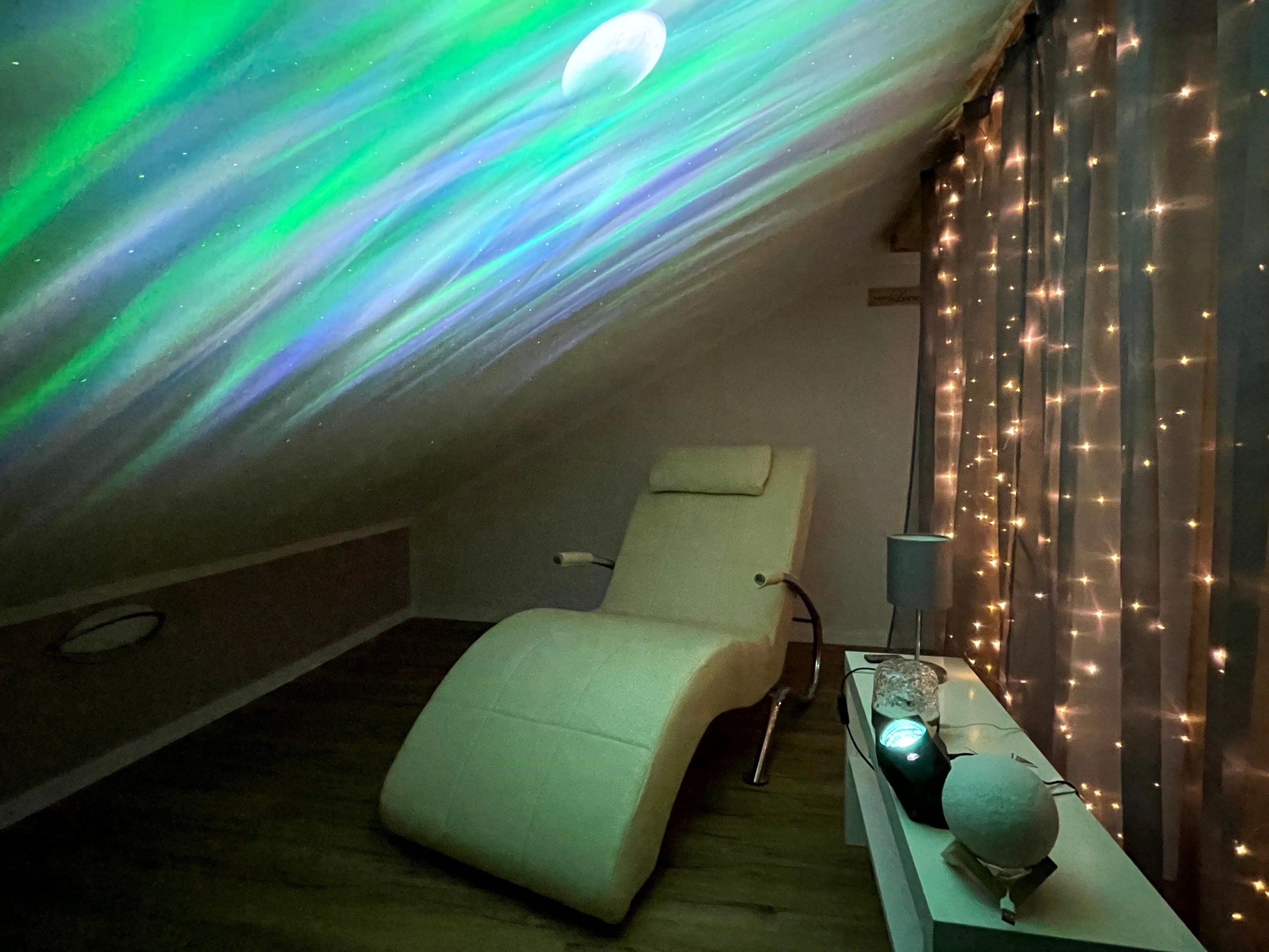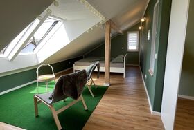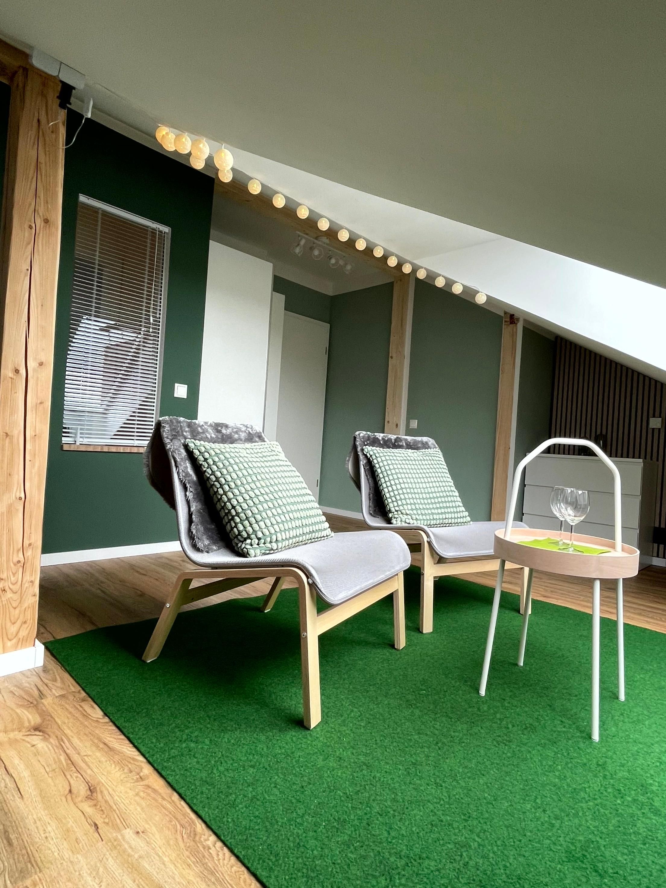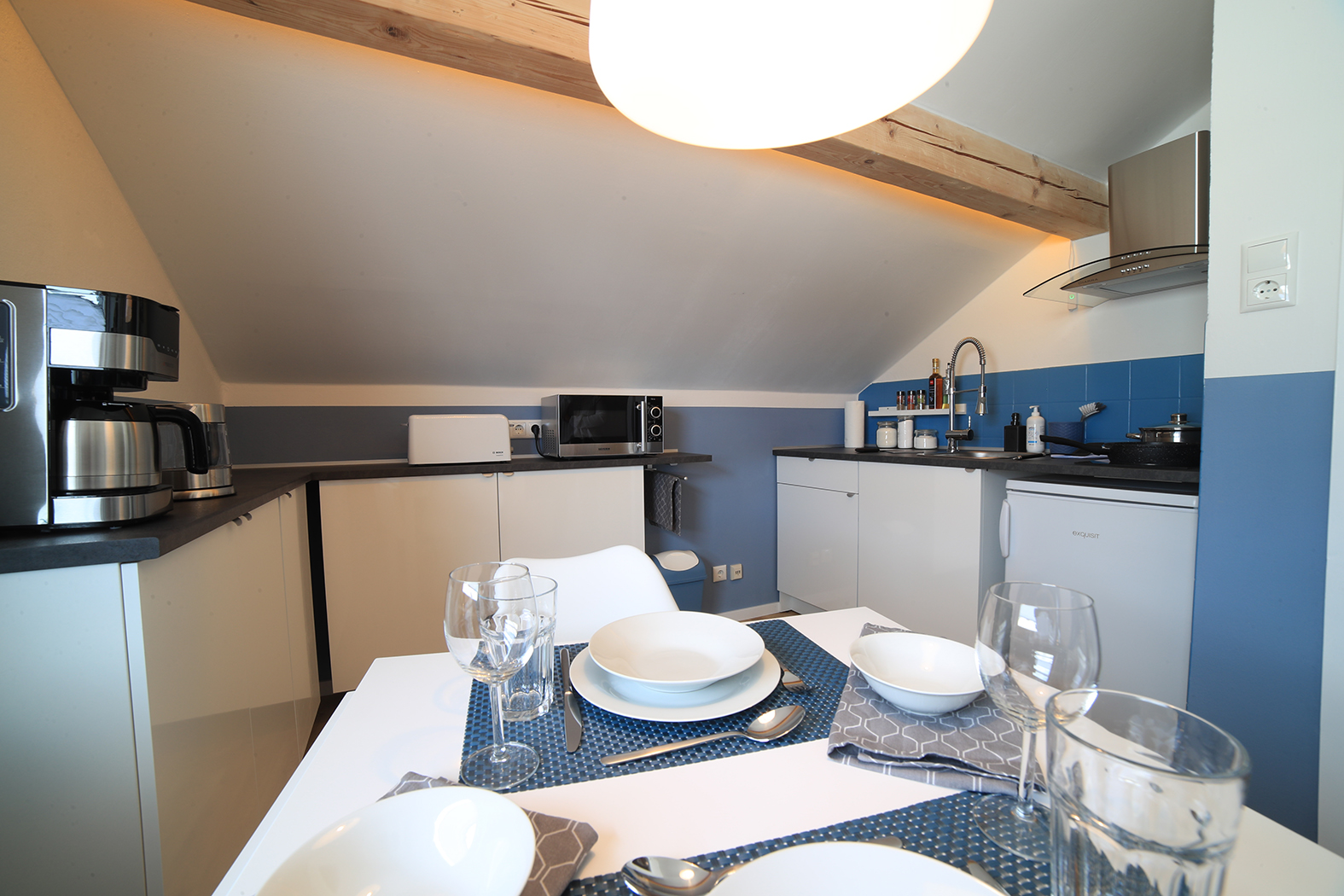 Hinweis: Personen über 1,85 m Körpergröße haben in der Küche (Spüle, Hängeschränke), in der Snoezelen-Lounge und im Schlafbereich aufgrund der Dachschräge evtl. Komforteinbußen.