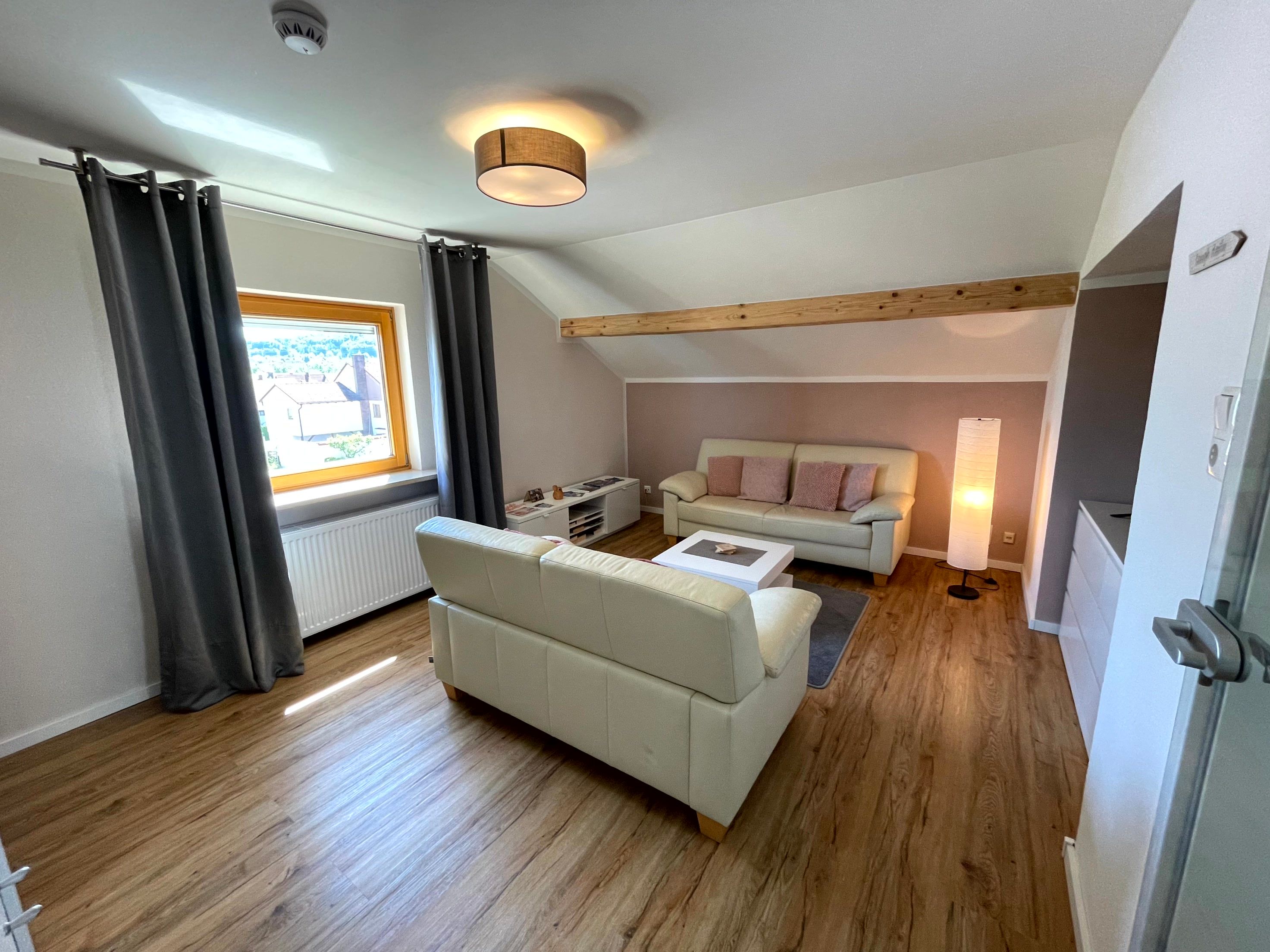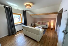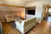 Wohnbereich: 2- und 3-Sitzer-Ledercouch, 50 Zoll-Fernseher, Snoezelen-Bereich mit Relaxliege, große Kommode und 2 Kleiderschränke