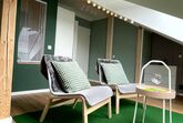 Schlafzimmer: Innen-Loggia mit Loungestühlen, Doppelbett mit zusätzlichem Topper, Kleiderschrank, Kommode und bei Buchung Zustellgästebett und Grundausstattung mit Bettwäsche und Handtüchern für Kind bis 12 Jahre (Kinderpreis)