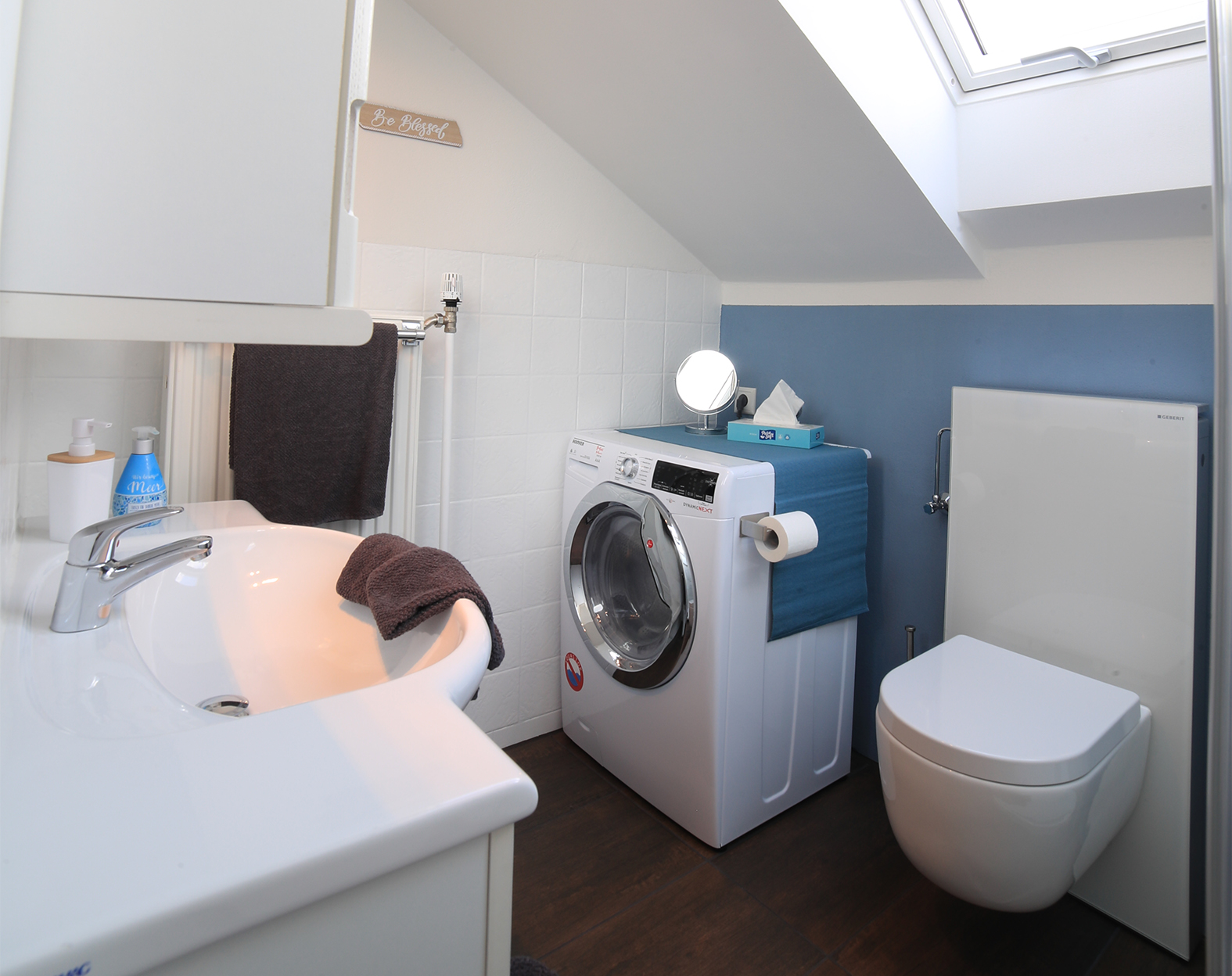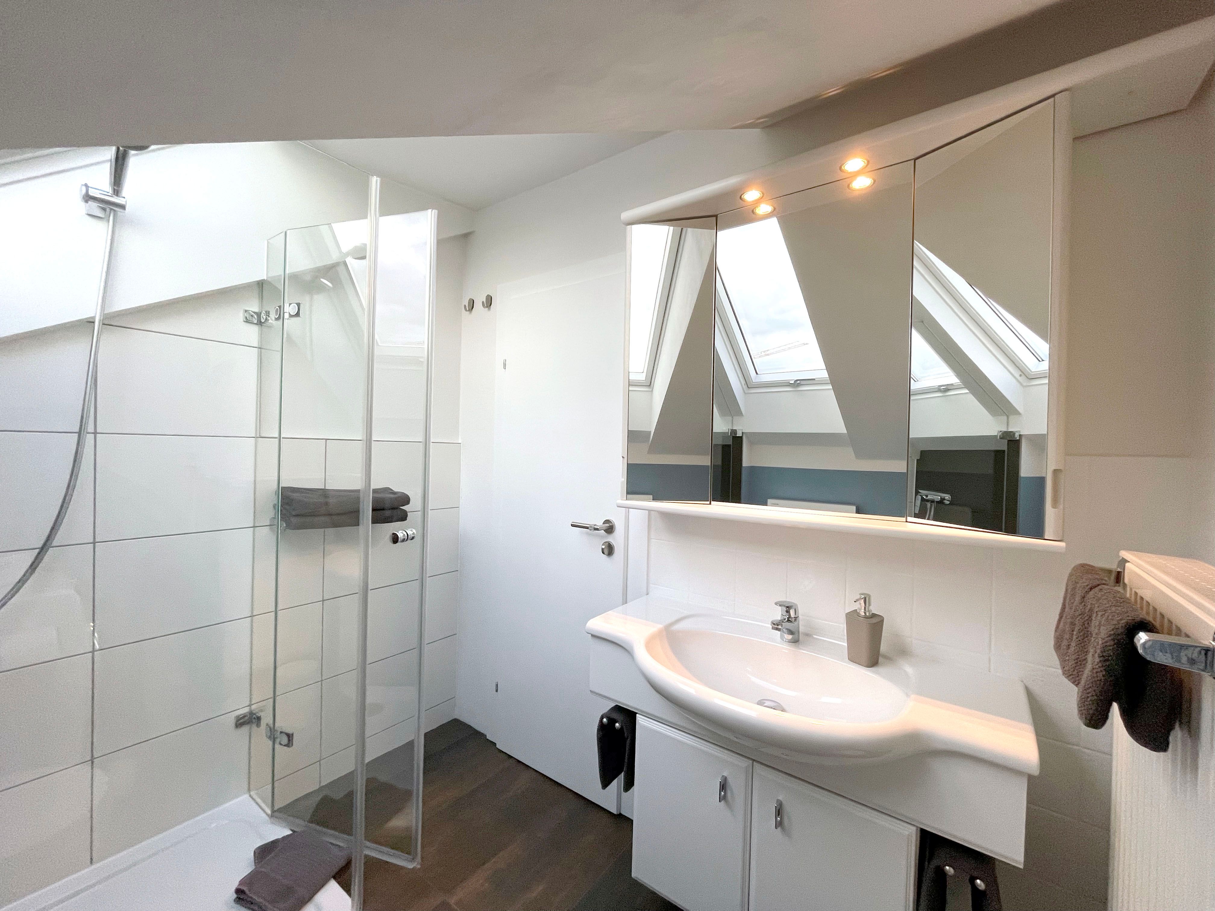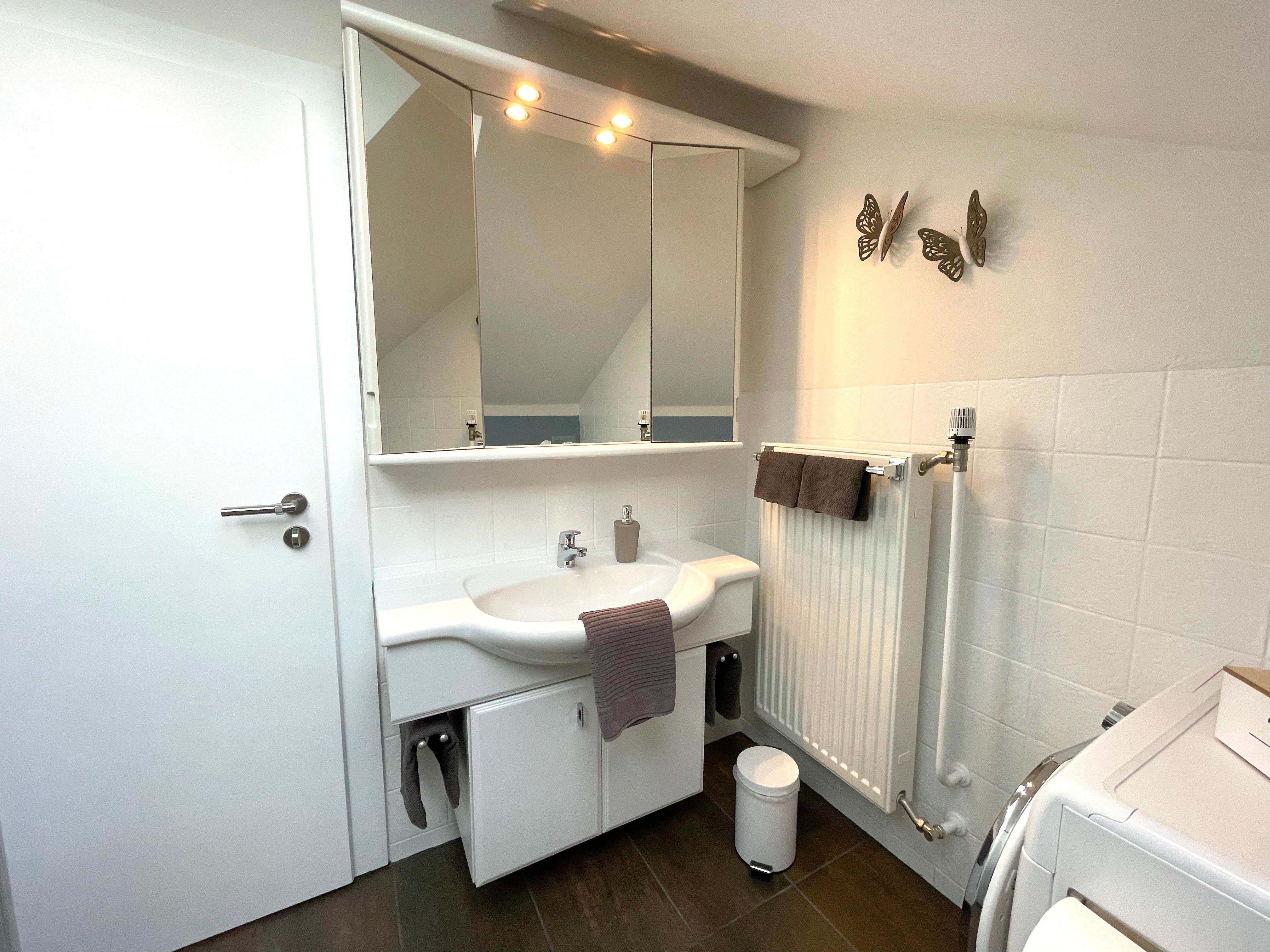 Bad: verglaste Dusche, Tiefspül-WC, Waschbecken mit Spiegelschrank, Waschtrockner, Vergrößerungsspiegel