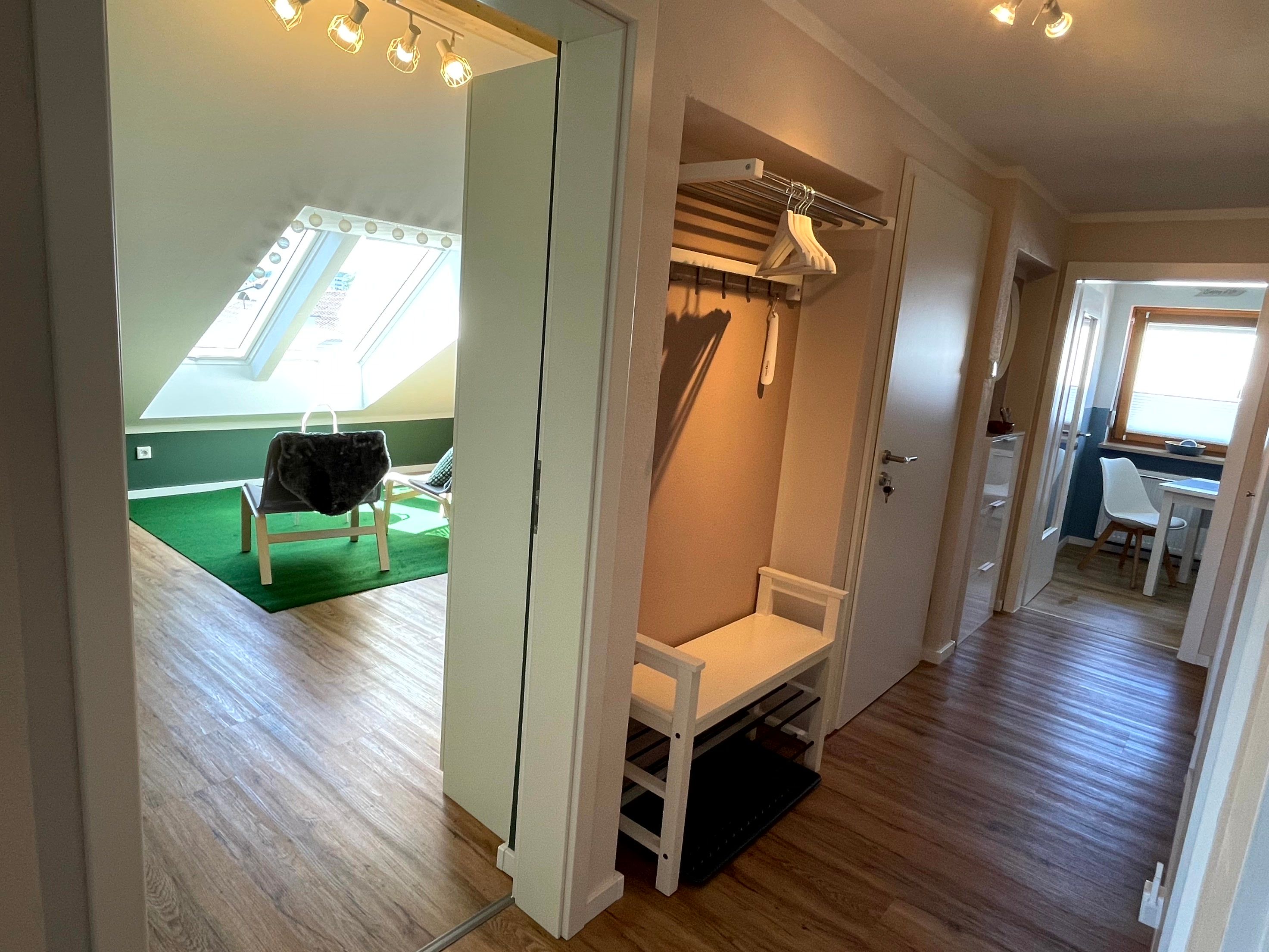 Garderobe und Abstellraum: Garderobe mit Sitzbank und Schuhschrank, Akku-Staubsauger, Wäscheständer