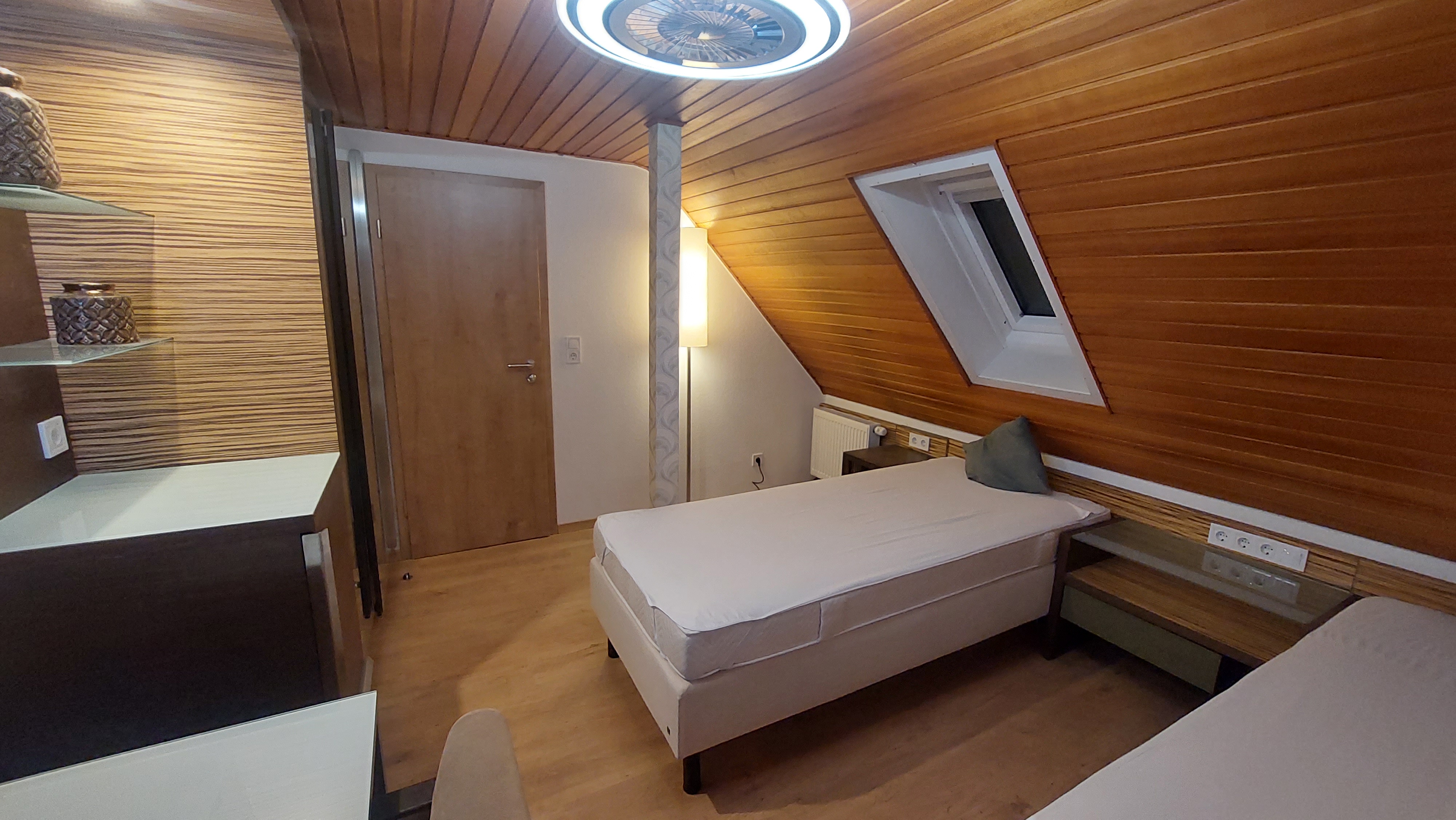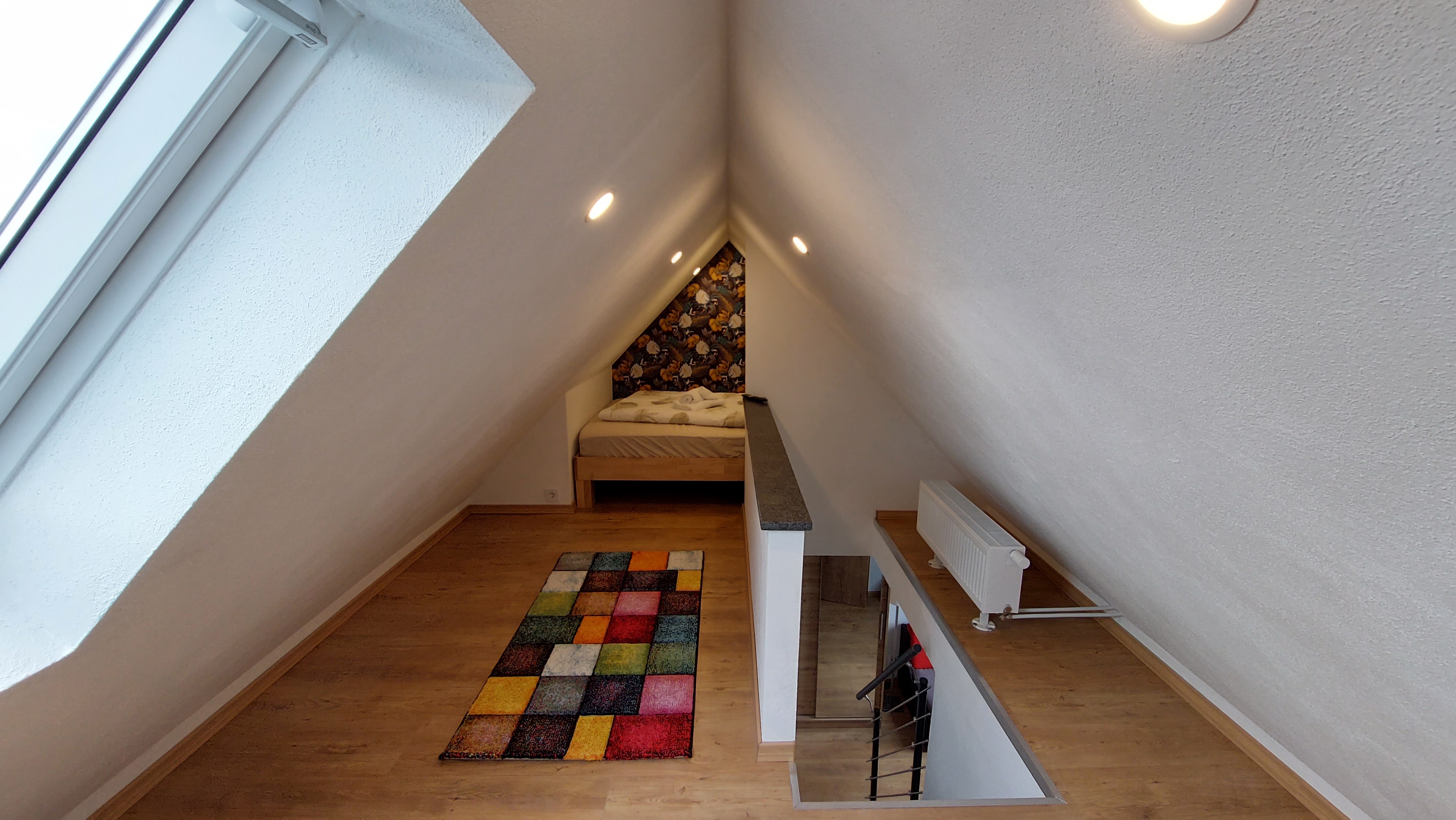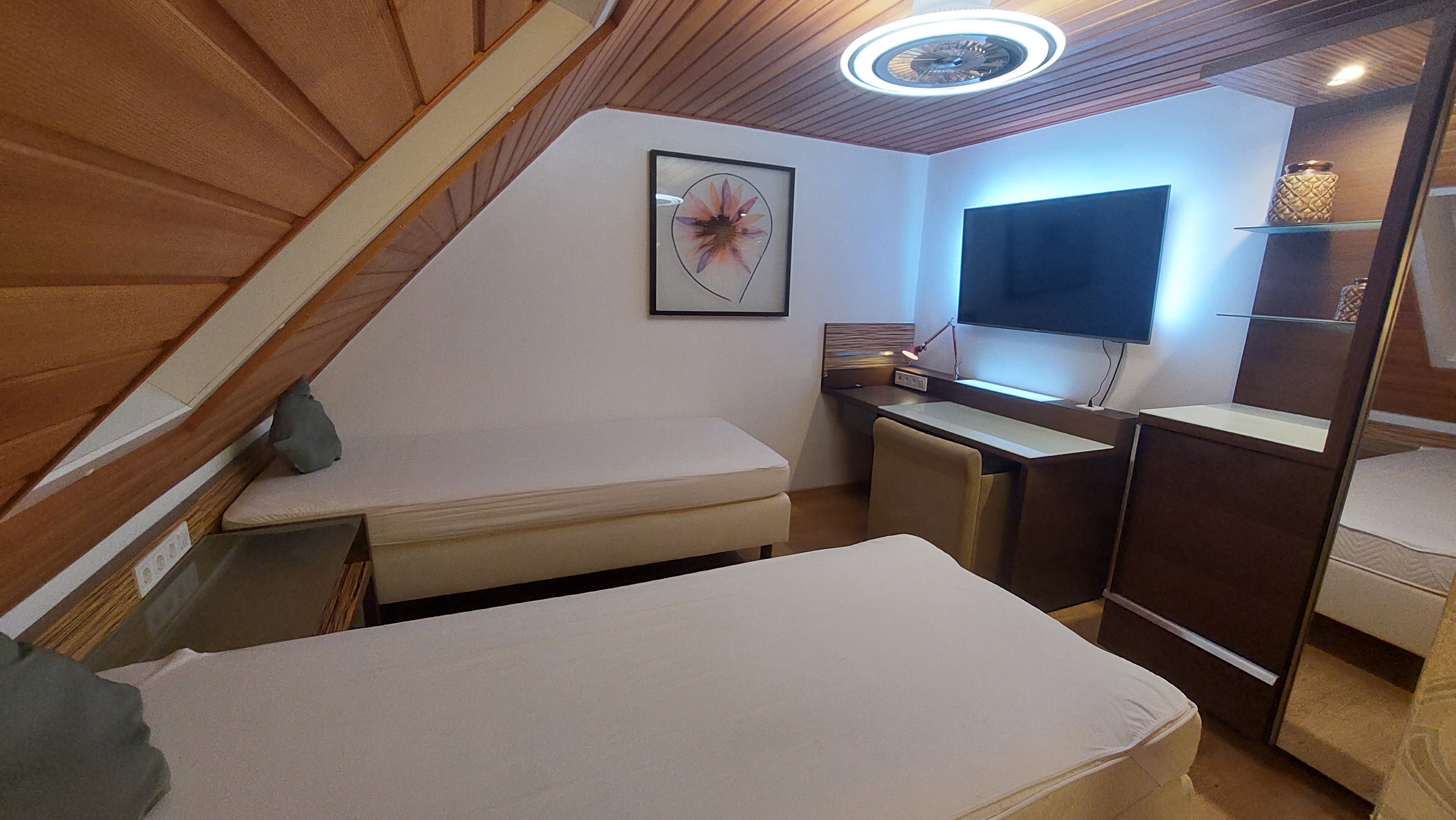 Highlight hierbei ist, dass das eigene Reich sich auf zwei Etagen im Atelier-Stil verteilt. Es gibt ein Wohnzimmer im 2.OG mit bequemer Schlafcouch (120x200cm), sowie 43-Smart-TV mit Ambilight und ein großen Schlafboden mit Schlaf-/Arbeitszimmer mit Französischen Bett (140x200cm), Schreibtisch und 26-Smart-TV im Dachgeschoss.