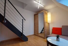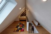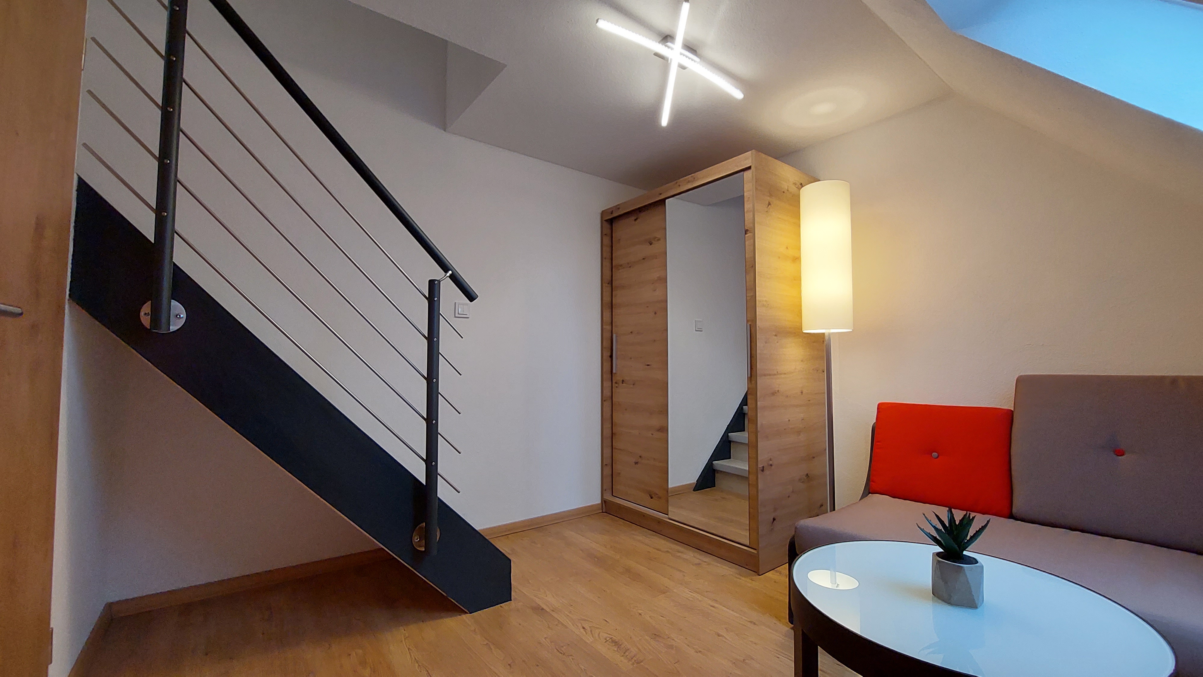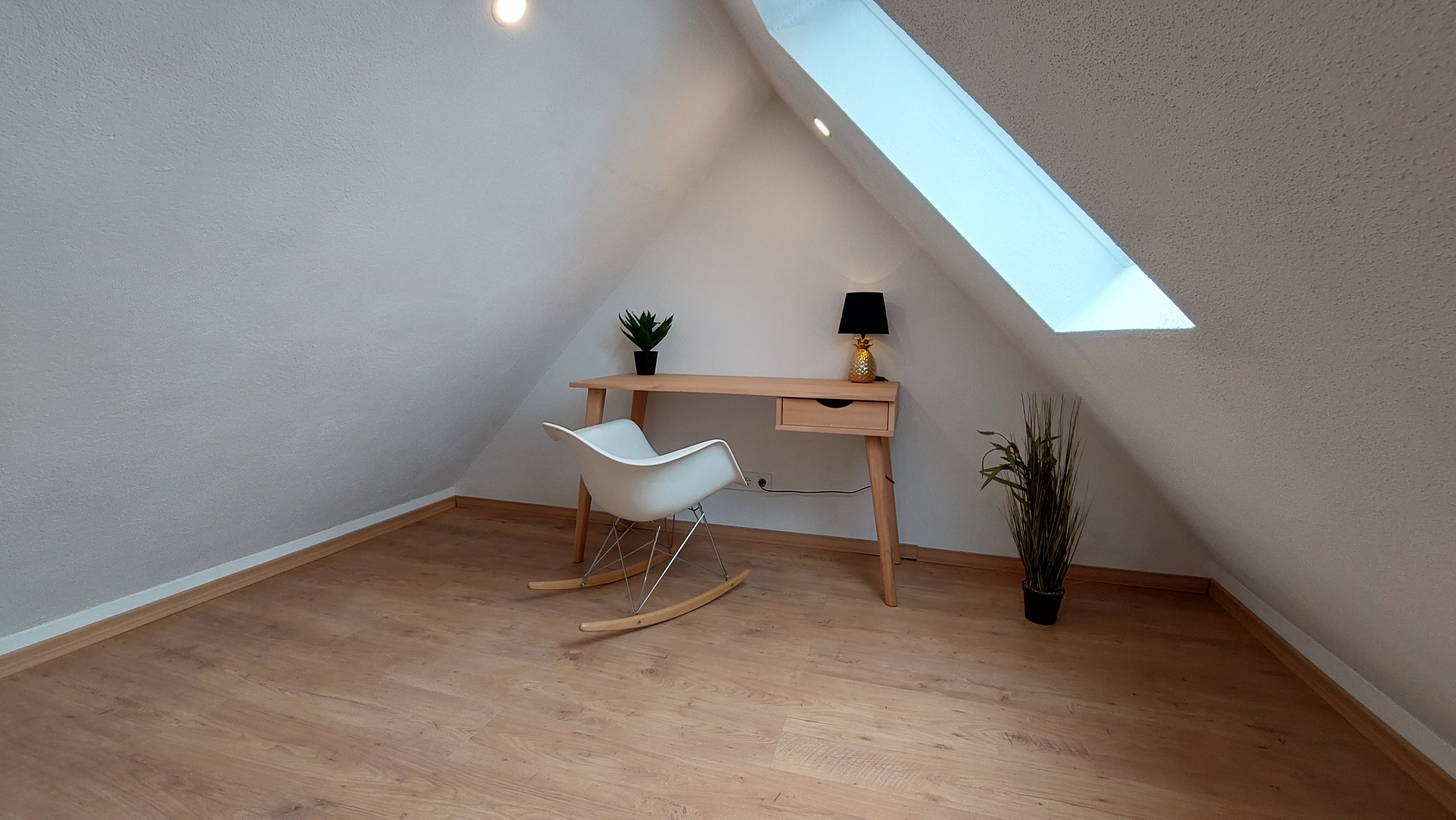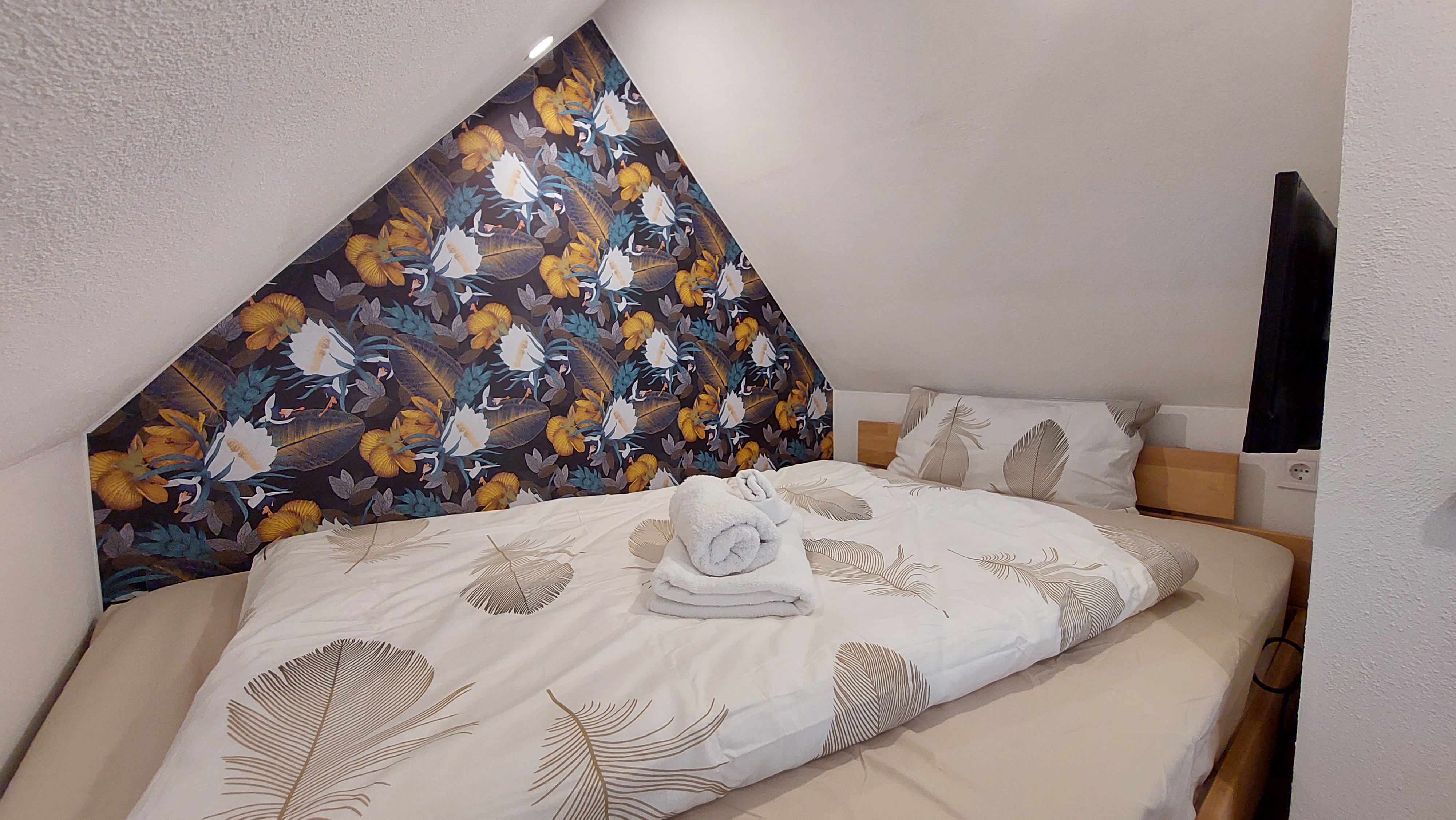 Highlight hierbei ist, dass das eigene Reich sich auf zwei Etagen im Atelier-Stil verteilt. Es gibt ein Wohnzimmer im 2.OG mit bequemer Schlafcouch (120x200cm), sowie 43-Smart-TV mit Ambilight und ein großen Schlafboden mit Schlaf-/Arbeitszimmer mit Französischen Bett (140x200cm), Schreibtisch und 26-Smart-TV im Dachgeschoss.