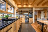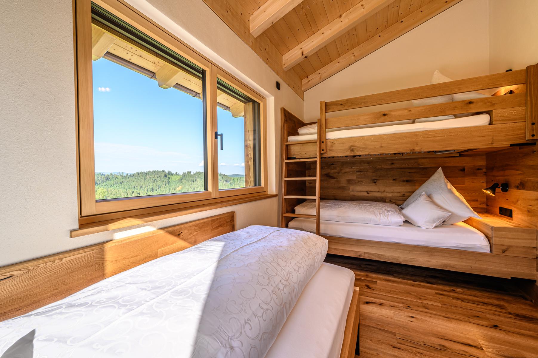 Zwei Schlafzimmer verfügen über ein Doppelbett und je einen Fernseher. Das dritte Schlafzimmer ist mit einem Stockbett und einem Einzelbett ausgestattet. Jedes Chalet verfügt über eine vollausgestattete Vollholzküche mit Kaffevollautomat, Weinkühlschrank, Mikrowelle, Spülmaschine, Wasserkocher, Eierkocher, Induktionskochfeld mit Nachuntenabzug, Gefrierschrank, Kühlschrank und einen Elektrogrill.