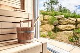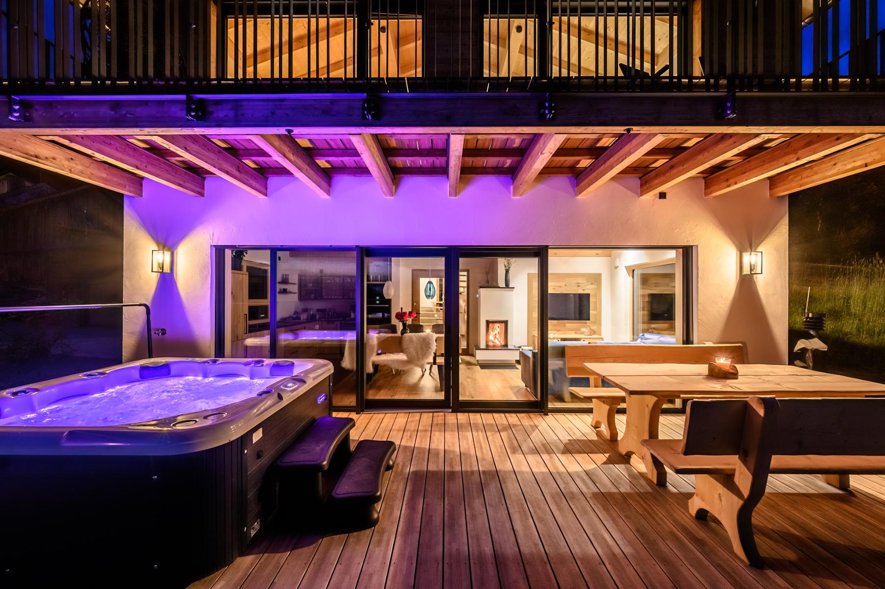 Genießen Sie einen entspannten Wellnesstag in der eigenen Fichtenholz- Sauna im Chalet. Nach einem ausgiebigen Saunagang mit Aufguss können Sie auf einem der zwei Daybeds im Saunabereich oder auf dem Holzdeck entspannen. Von der Sauna aus gelangt man direkt auf das Holzdeck mit dem großen Whirlpool und weiteren Liegen.