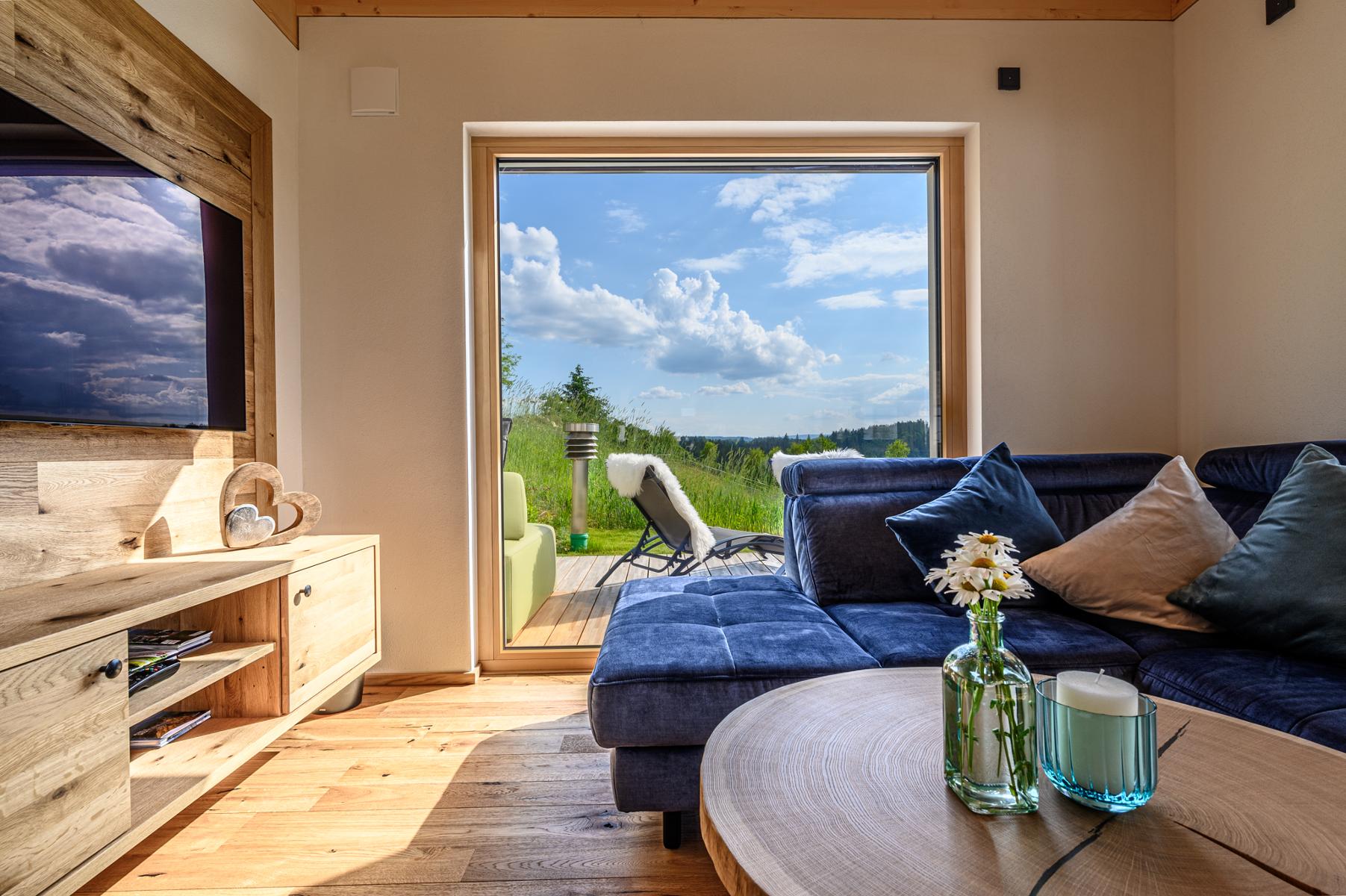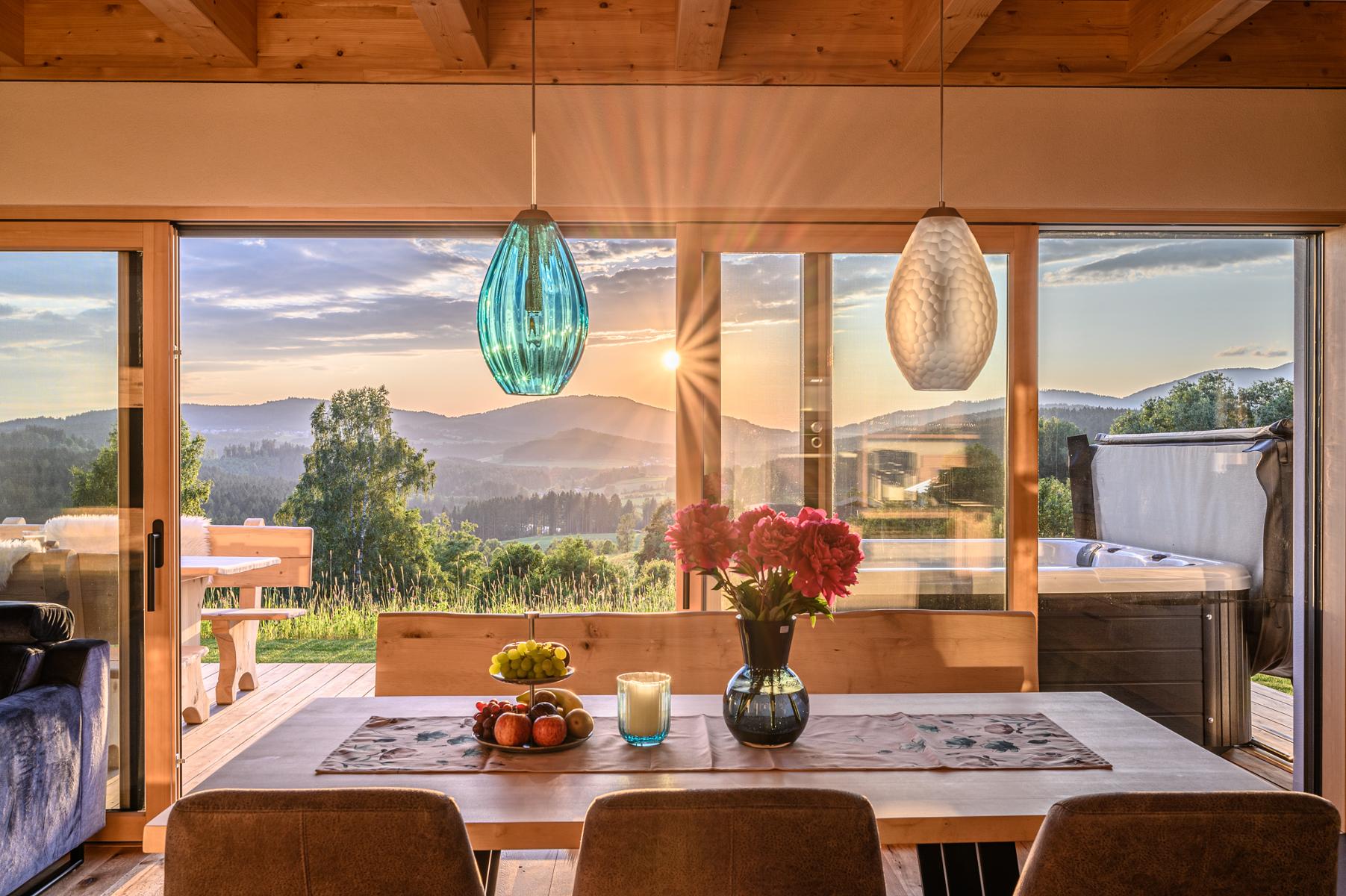 Unsere natürlich und nachhaltig eingerichteten Chalets laden mit eigenem Whirlpool auf der Panorama-Terrasse und großzügiger, eigener Natur-Holz-Sauna zum Wohlfühlen und Entspannen ein.