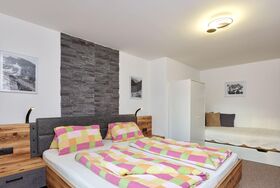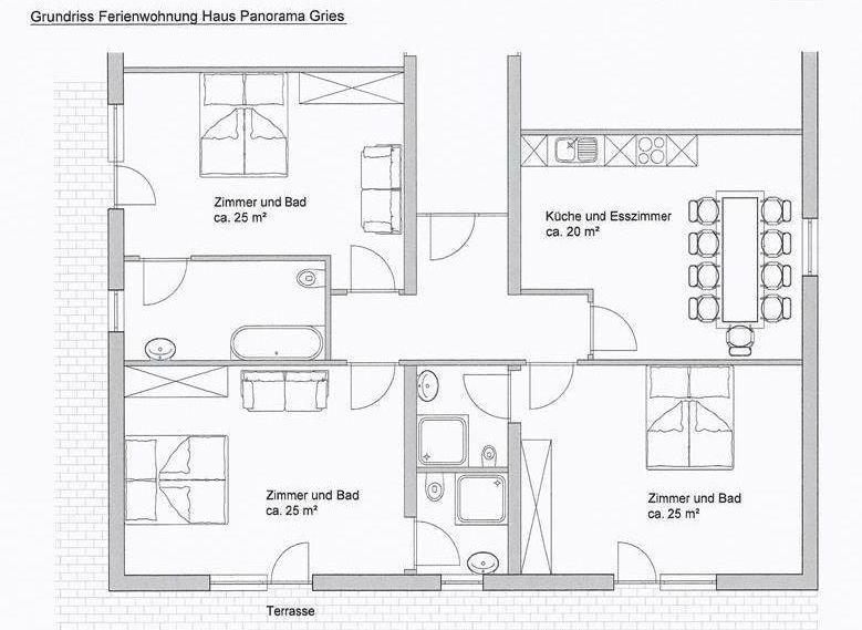 Appartement Panorama gross bestehend aus: 1 Vorraum, vollausgestattete Wohnküche mit grosser Essecke, Geschirrspüler, Cerankochfeld mit Backrohr, Kühlschrank, Gefriertruhe, Kaffeemaschine, usw., 2 Doppelzimmer, 1 großes Schlafzimmer mit 2 Doppelbetten, 1 Doppelzimmer mit Dusche/WC (angrenzend an die Einheit), 3 Badezimmer mit Dusche/WC, SAT-TV, Terrasse.  Größe: ca. 50-140 m²