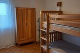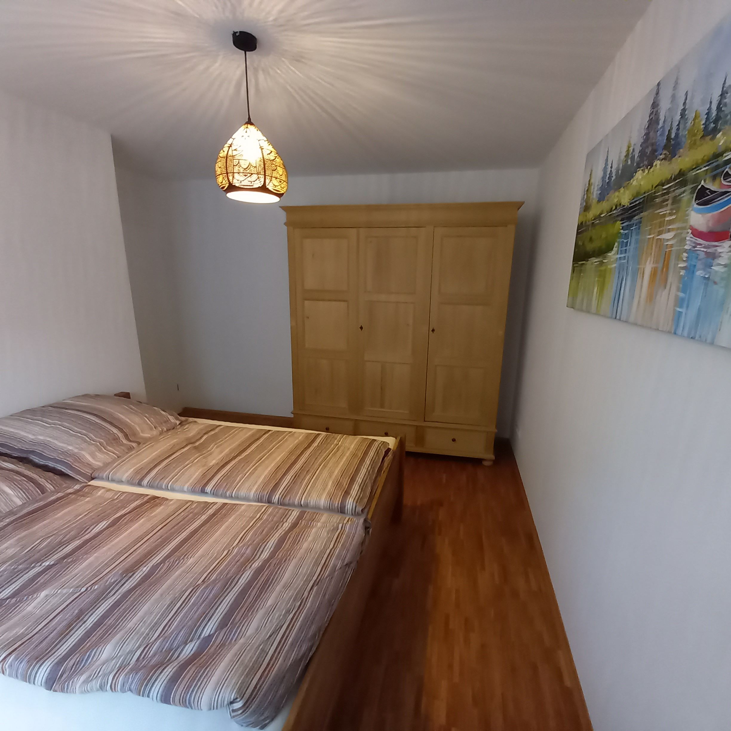 Es gibt zwei Schlafzimmer, eines verfügt über ein Doppelbett mit großem Kleiderschrank, das zweite über ein Etagenbett, Schreibtisch und Kleiderschrank. Die Küche ist voll ausgestattet und verfügt unter anderem über einen Herd mit Backofen, einen Kühlschrank und einen Gefrierschrank, eine Spülmaschine sowie Kaffeeautomat, Mikrowelle, Toaster, Wasserkocher, Eierkocher. Geschirr, Besteck und Pfannen/Töpfe sind vorhanden. Geschirrtücher, Handtücher und Bettwäsche sind im Preis inbegriffen. Eine große sonnige Terrasse mit Fernsicht und Gartennutzung gehören ebenso zu diesem Ensemble. Es handelt sich um eine Nichtraucherwohnung. W-Lan und Parkplatz sind inklusive.