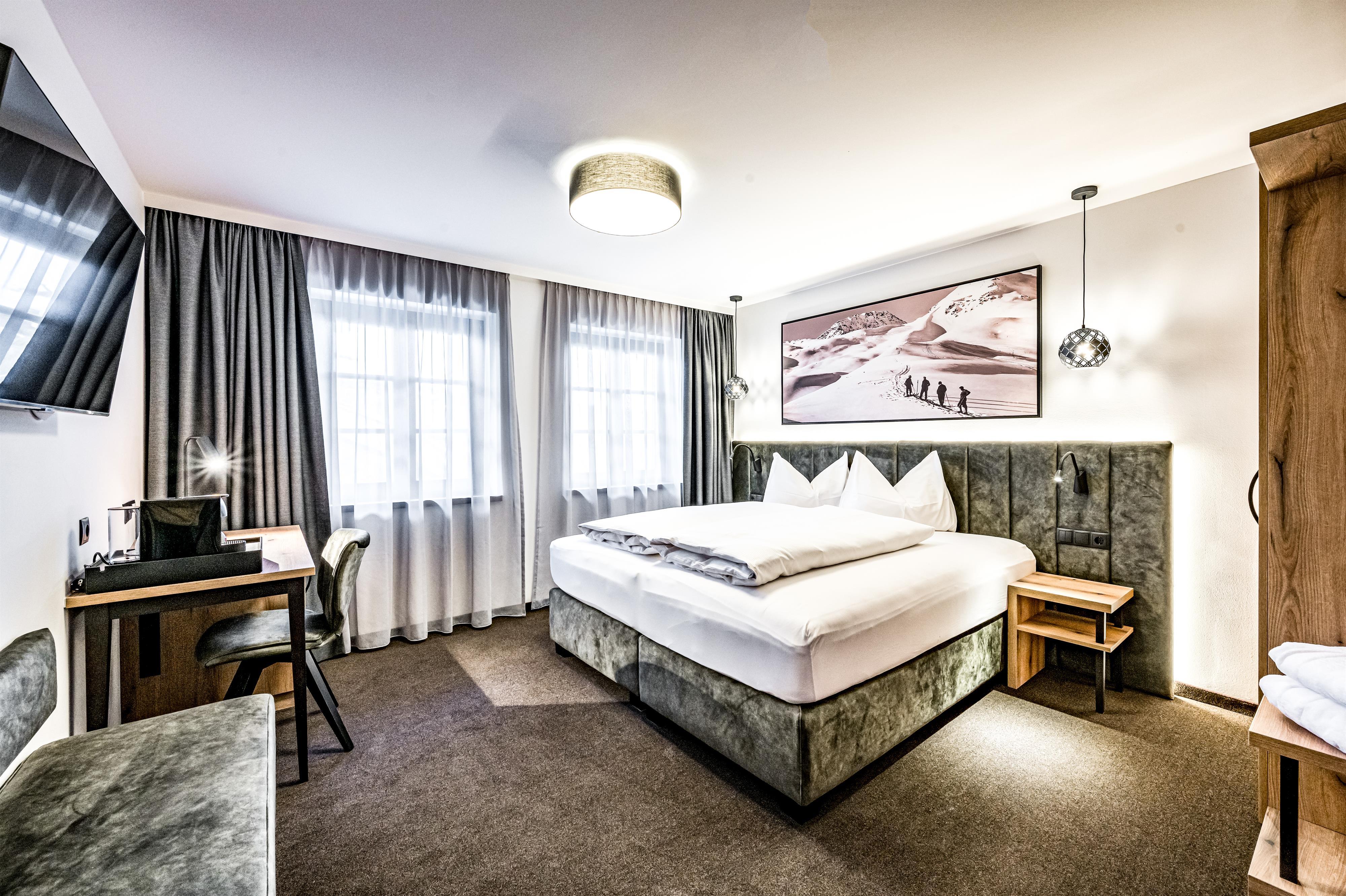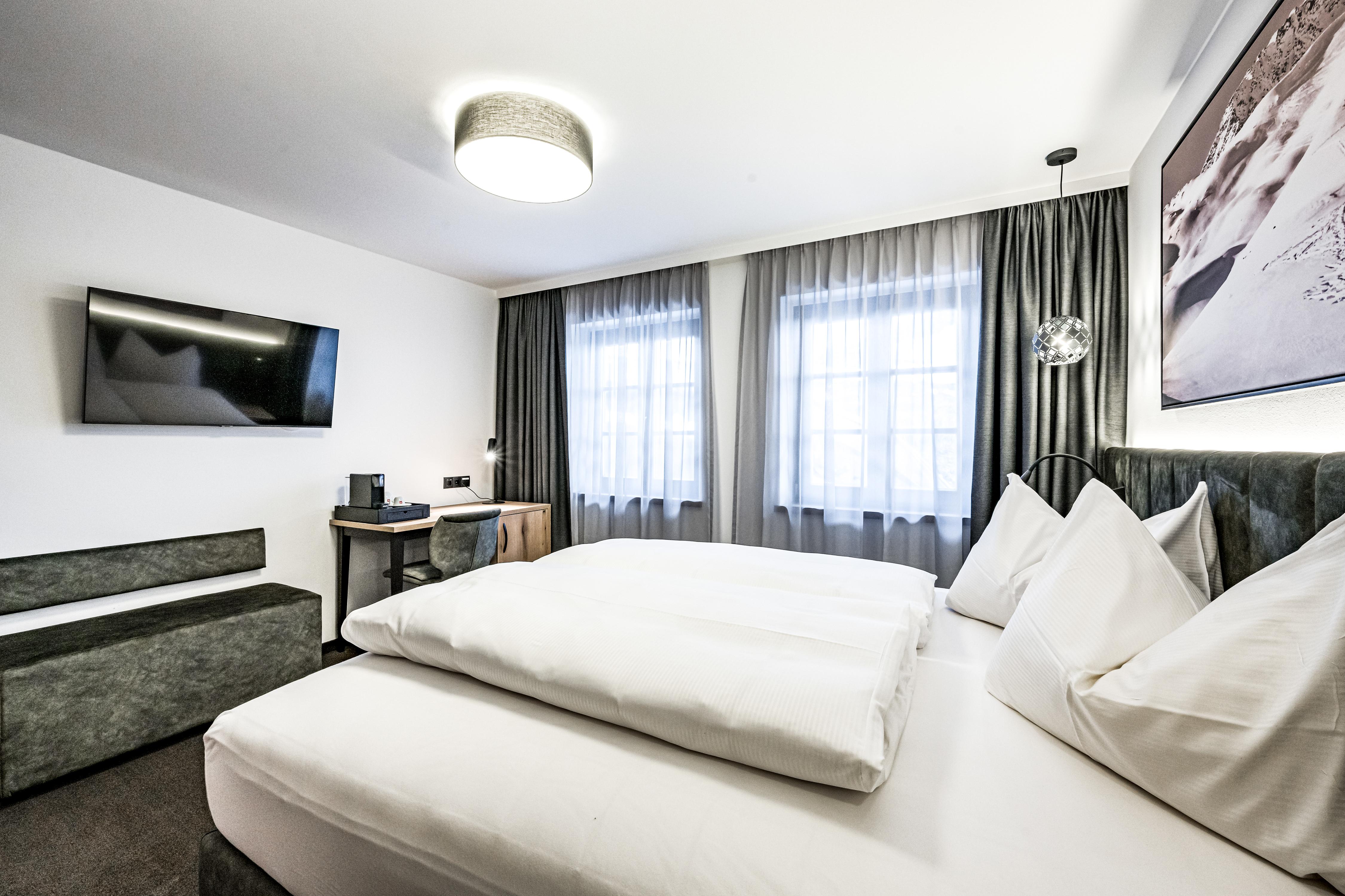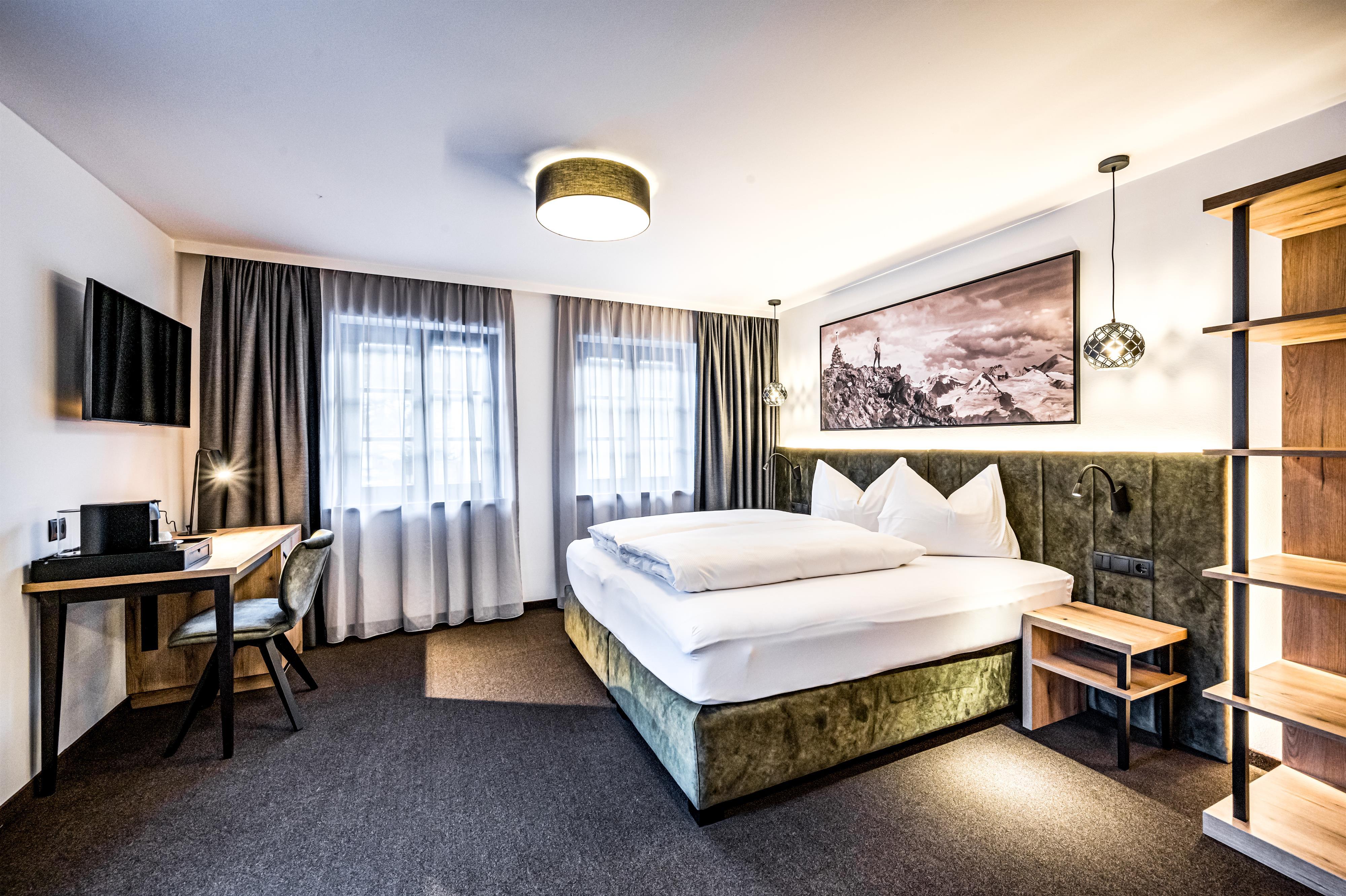Unsere Komfortzimmer Deluxe Summit mit ca. 33 m² bestehet aus: 1 Doppelbett; Badezimmer mit WC, Waschbecken, offener Dusche mit Regenbrause (ebenerdig begehbar), Handtuchtrockner und Fön; Safe; Minibar, Smart-TV - kompatibel für Netflix, Prime & Co, Parkplatz; Abweichungen vom Grundriss möglich; Auf Anfrage Schlafmöglichkeit für 3. und 4. Person