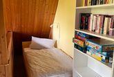 Auf 80qm ist Platz für 4 Personen. Im Obergeschoss befindet sich das Schlafzimmer mit zwei Betten, auf Anfrage kann ein Kinderbett dazu gestellt werden. Im Vorraum sind zwei weitere Schlafplätze. Im Erdgeschoss befindet sich der große, sonnige Wohn- und Essbereich, mit Kaminofen und TV, ein kleines Badezimmer und eine separate Toilette. Die Küche ist gut ausgestattet, eine Spülmaschine ist vorhanden. Von der Küche aus gibt es einen direkten Zugang zum großen Garten. am Haus ist ein überdachter Freisitz, in dem man gemütliche Abende verbringen kann. Ein Grill ist vorhanden.