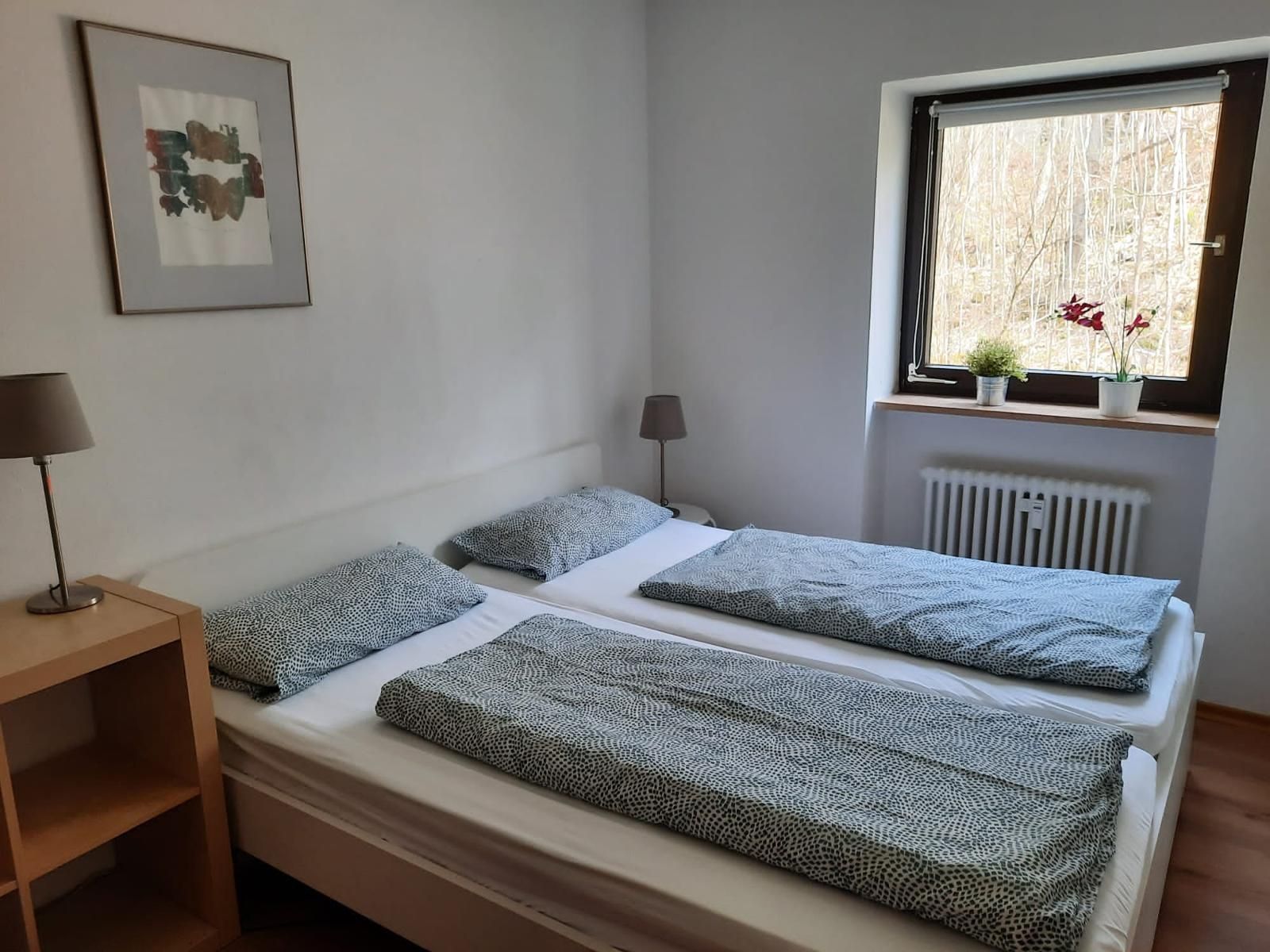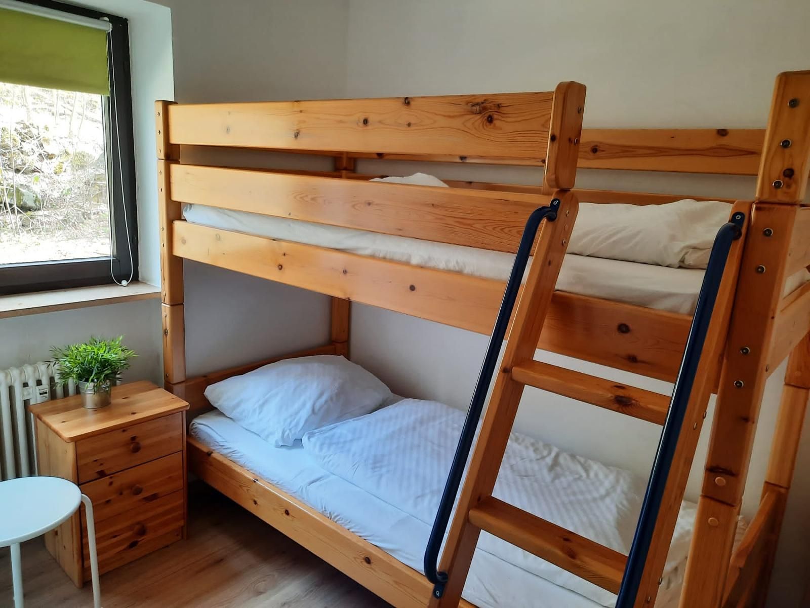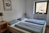 Das ruhig gelegene Schlafzimmer mit Blick in den Wald verfügt über ein Doppelbett (1,80 x 2,00m) und ein Stockbett (2x 0,90 x 2,00m), welches durch eine Zwischenwand mit Schiebetür räumlich abgetrennt ist.