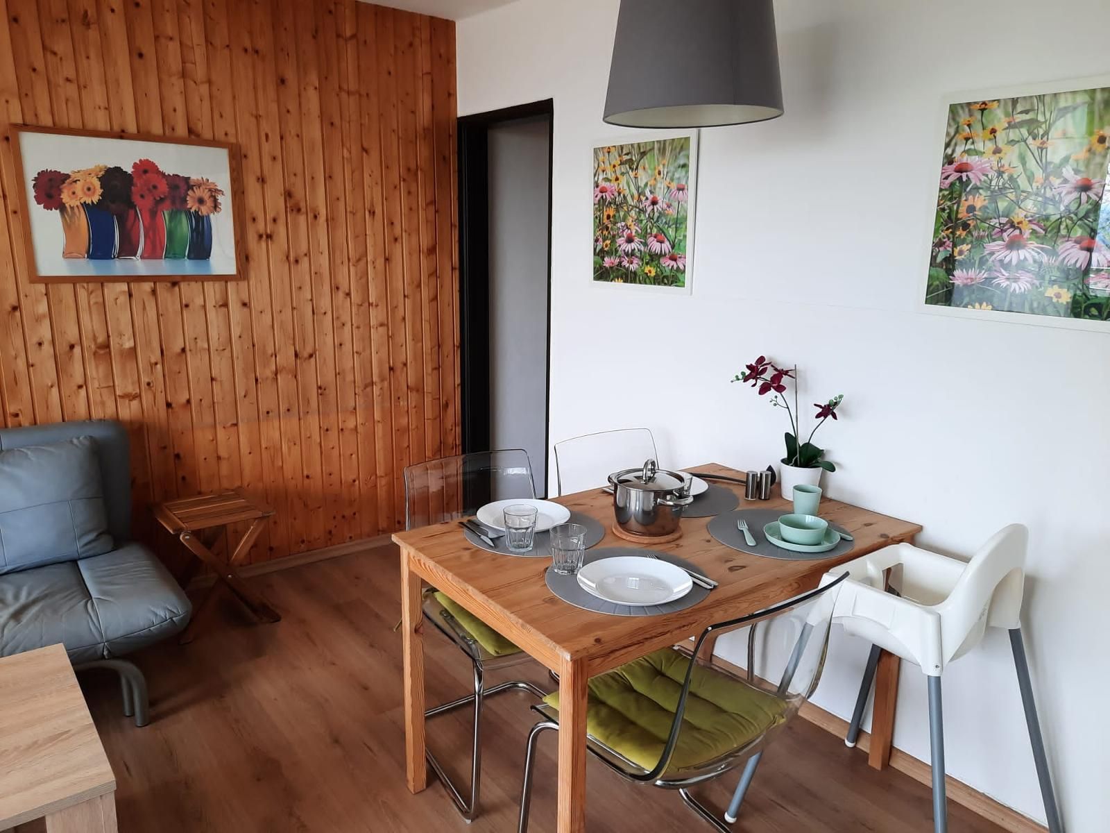 Rausfallschutz für Säuglinge und Kleinkinder auf Anfrage möglich. Hochstuhl auf Anfrage möglich. Zustellbett (Schlafsofa) auf Anfrage möglich.