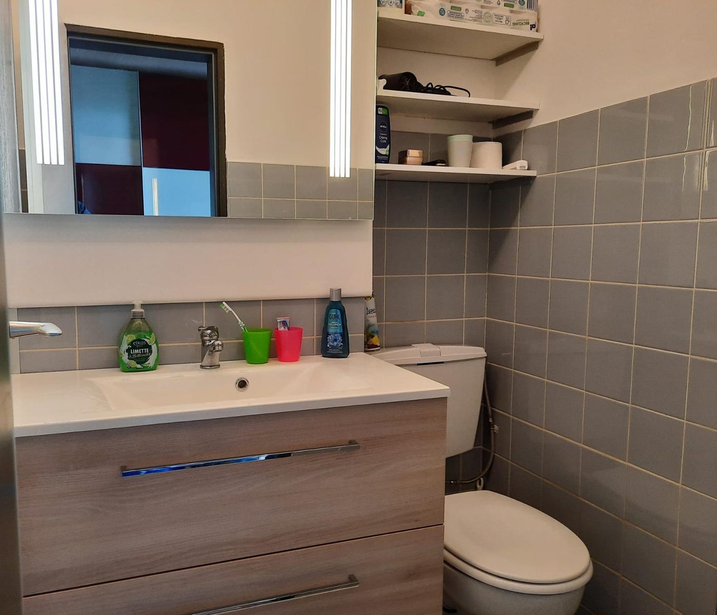 Im innenliegenden Bad befindet sich neben WC und Waschbecken auch die Dusche. Ein geräumiger Flur rundet das Apartment ab.