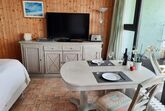 In dem hellen, behaglichen Wohn/Schlafzimmer befindet sich ein gemütliches Sofa, sowie der Esstisch. Dazu kommt das hochklassige Boxspringbett mit elektrisch verstellbaren Kopf- und Fussteil. Vom Bett aus kann man auch den tollen Fernblick genießen. Man fühlt sich wie auf Wolke 7.