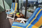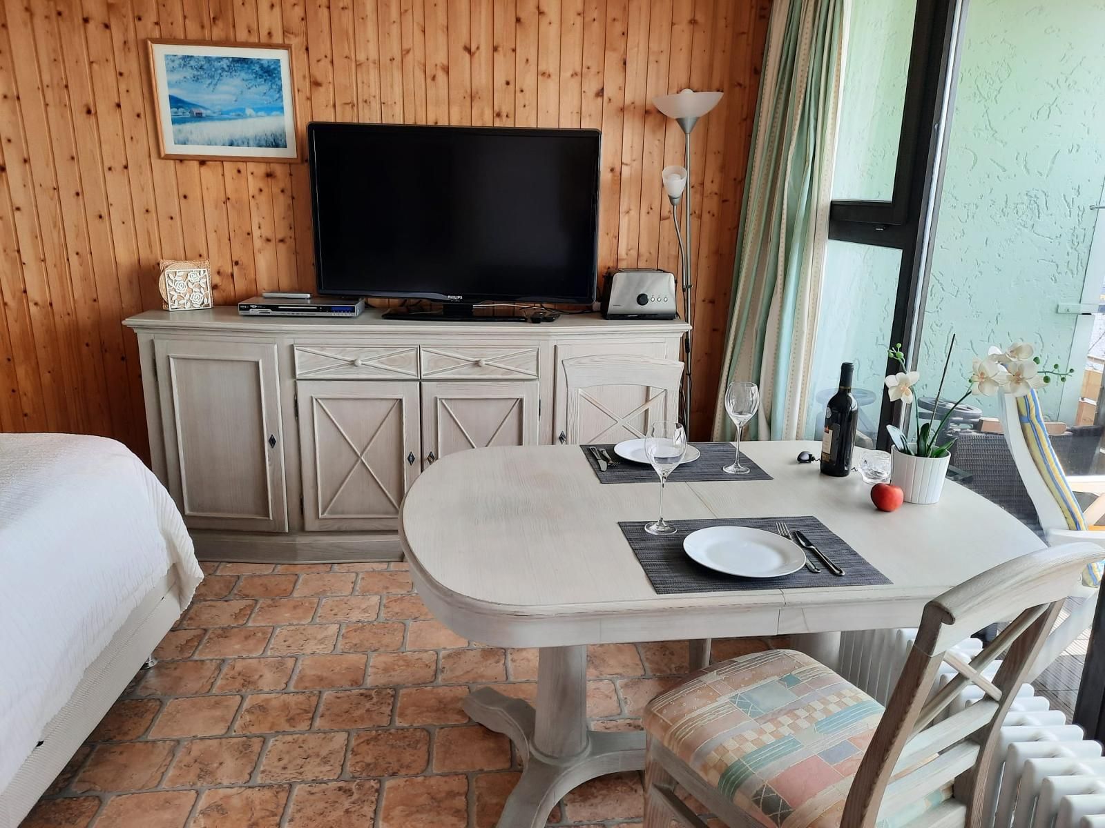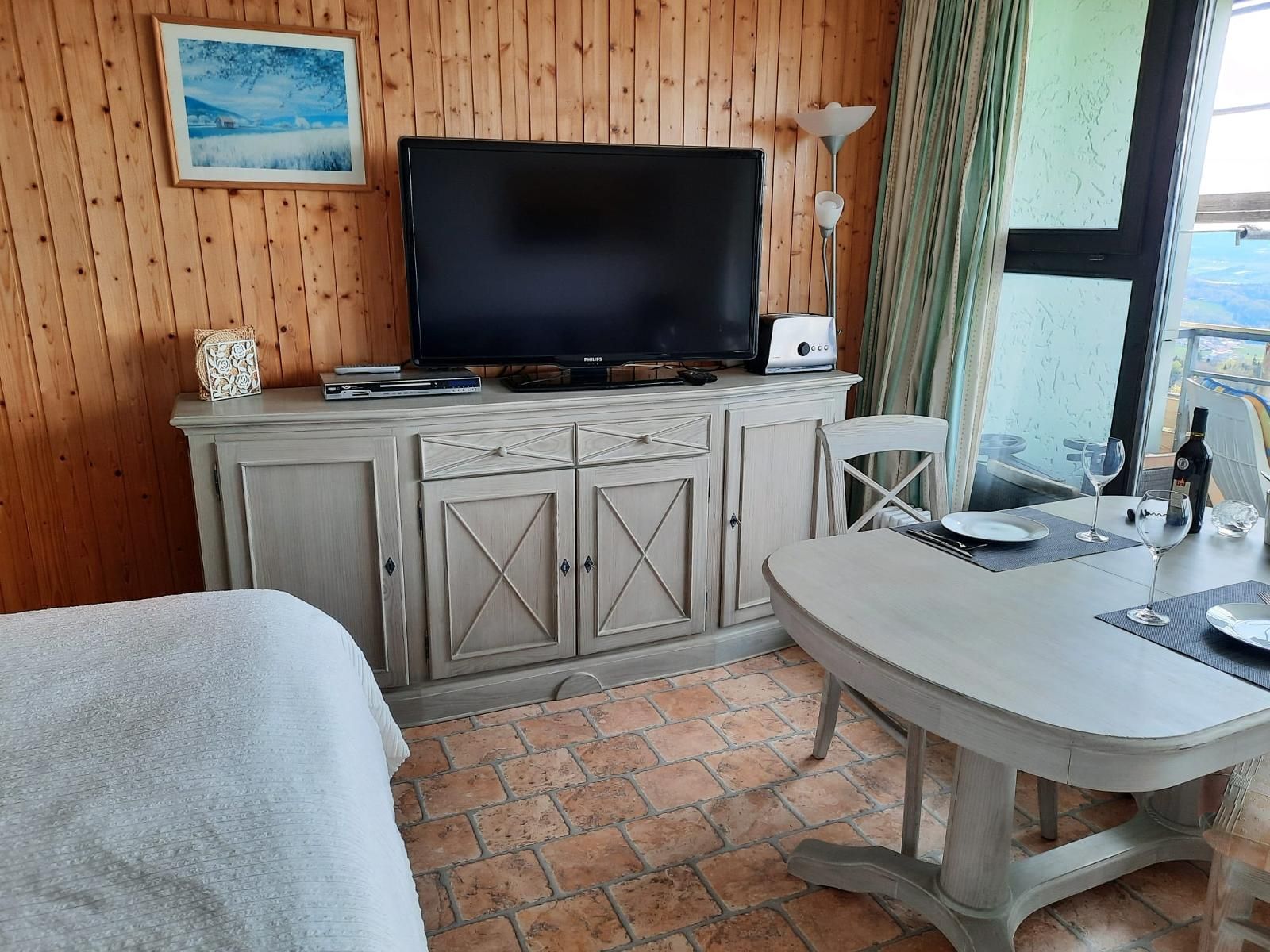Das 1-Zimmer-Apartment hat einen großen Balkon mit traumhaftem Fernblick. Bei gutem Wetter kann man bis zu den Alpen sehen.