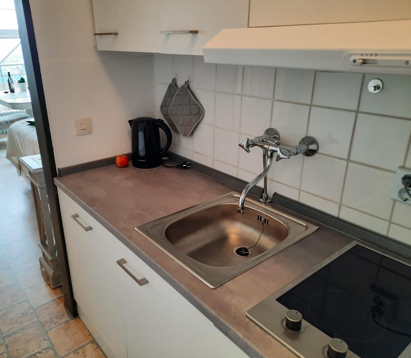 Die Küche ist klein, modern und mit einer Kühlschrank mit Gefrierfach, Dunstabzug und einem Cerankochfeld sowie Backofen funktionell eingerichtet und voll ausgestattet. Eine Geschirrspülmaschine ist ebenfalls Teil der Küche.