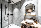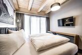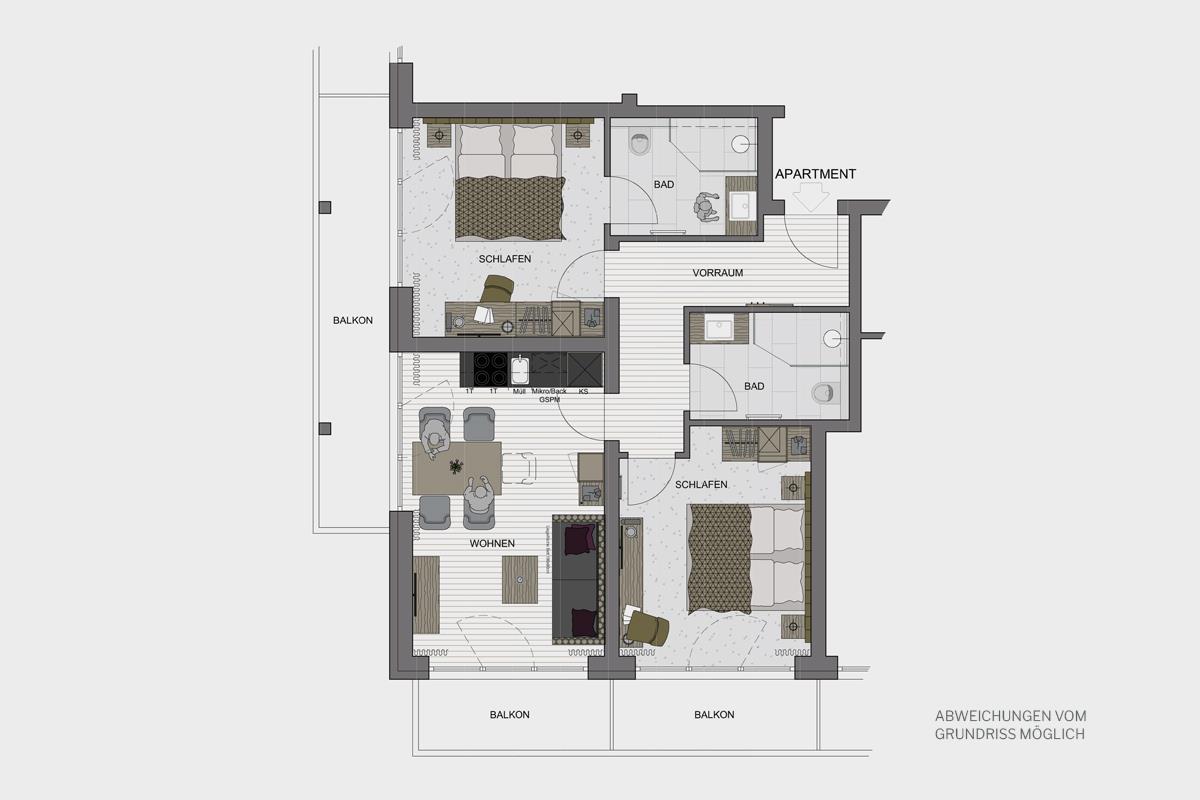 ALPINE Apartment mit ca. 65 m²: 2 Schlafzimmer mit Smart TV; 2 Badezimmer mit ebenerdiger Regendusche, WC und Haarföhn - 1 davon angrenzend an das Master-Bedroom, das 2. an den Wohnbereich; offener Wohnraum mit gemütlicher Couch, Küche (komplett ausgestattet mit Ceran-Kochfeld, Mikrowelle, Kühlschrank, Geschirr, uvm.) und Esstisch, Smart TV, kompatibel für Netflix, Prime & Co; Geschirrtücher vorhanden; auf Anfrage ist eine 5.+6. Person möglich; Balkon bzw. Terrasse. Frühstück vor Ort auf Anfrage zubuchbar.