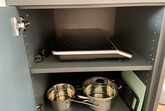 Zur Einrichtung gehört eine Küchenzeile mit Sitzgelegenheit, in der Sie alles finden was sie zum Kochen brauchen, inkl. Induktionsplatte, Mikrowelle und Kühlschrank.