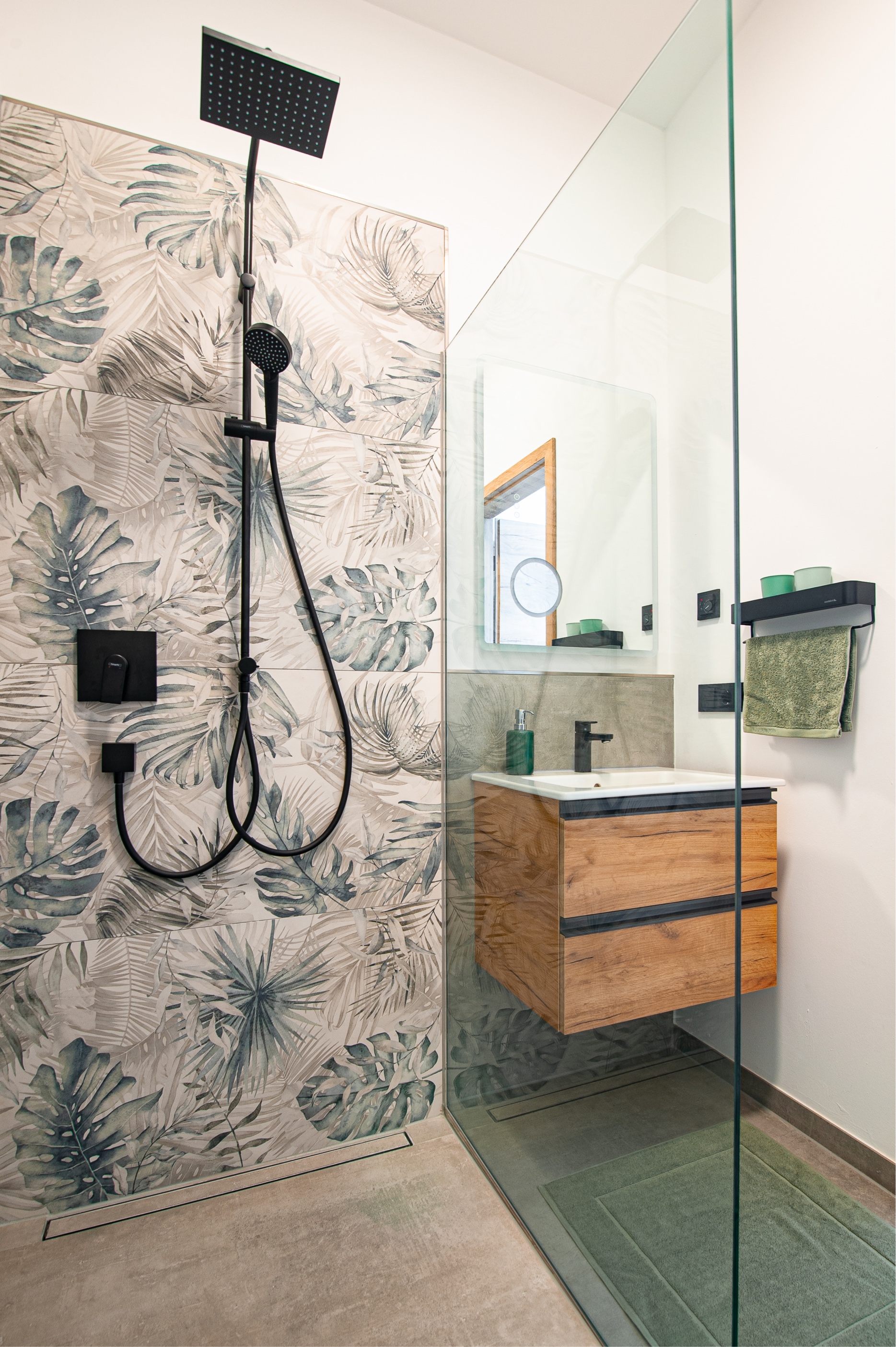 In Ihrem Bad finden Sie eine Regendusche, WC, einen Spiegel mit integriertem Kosmetikspiegel, Handtücher und einen Föhn.