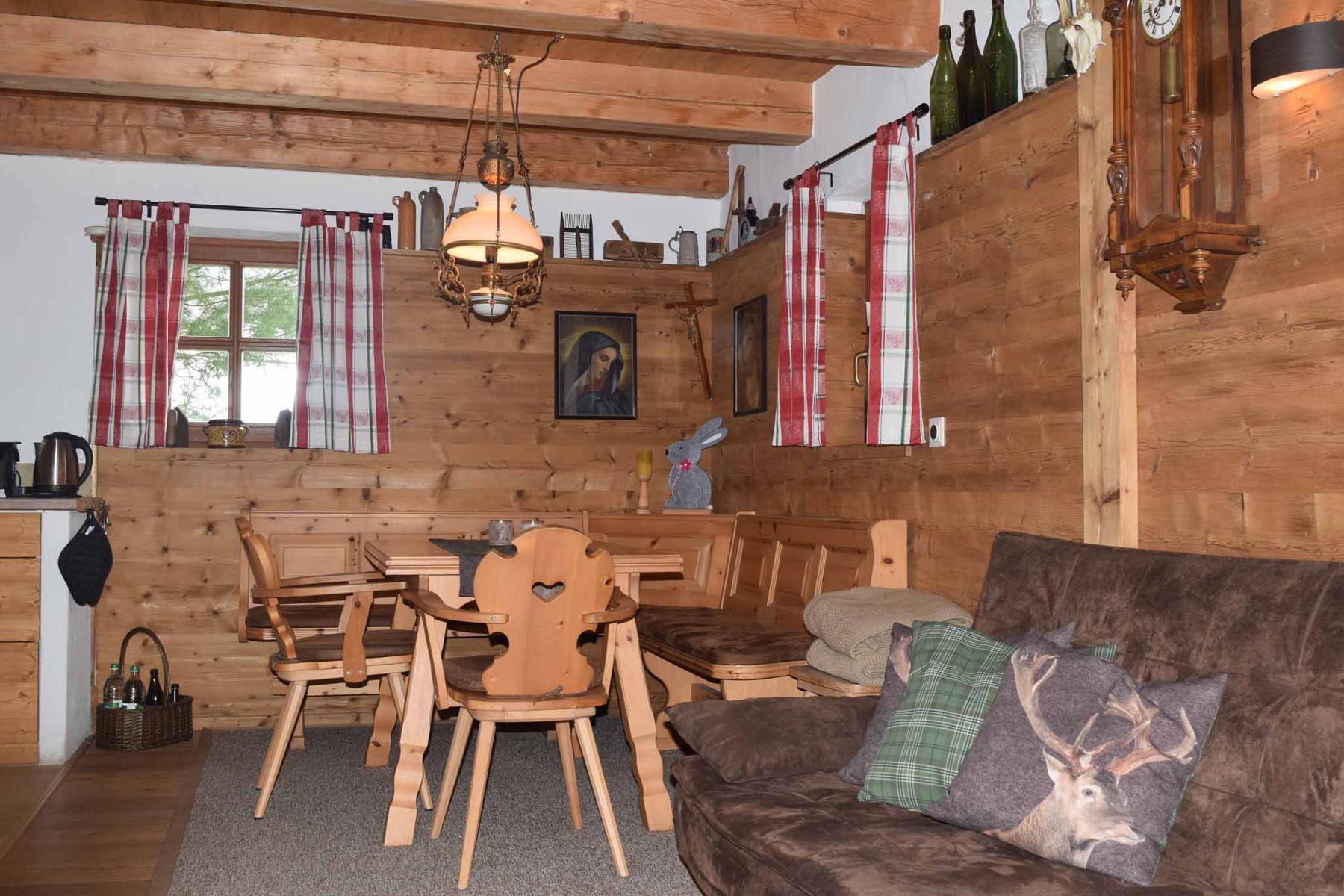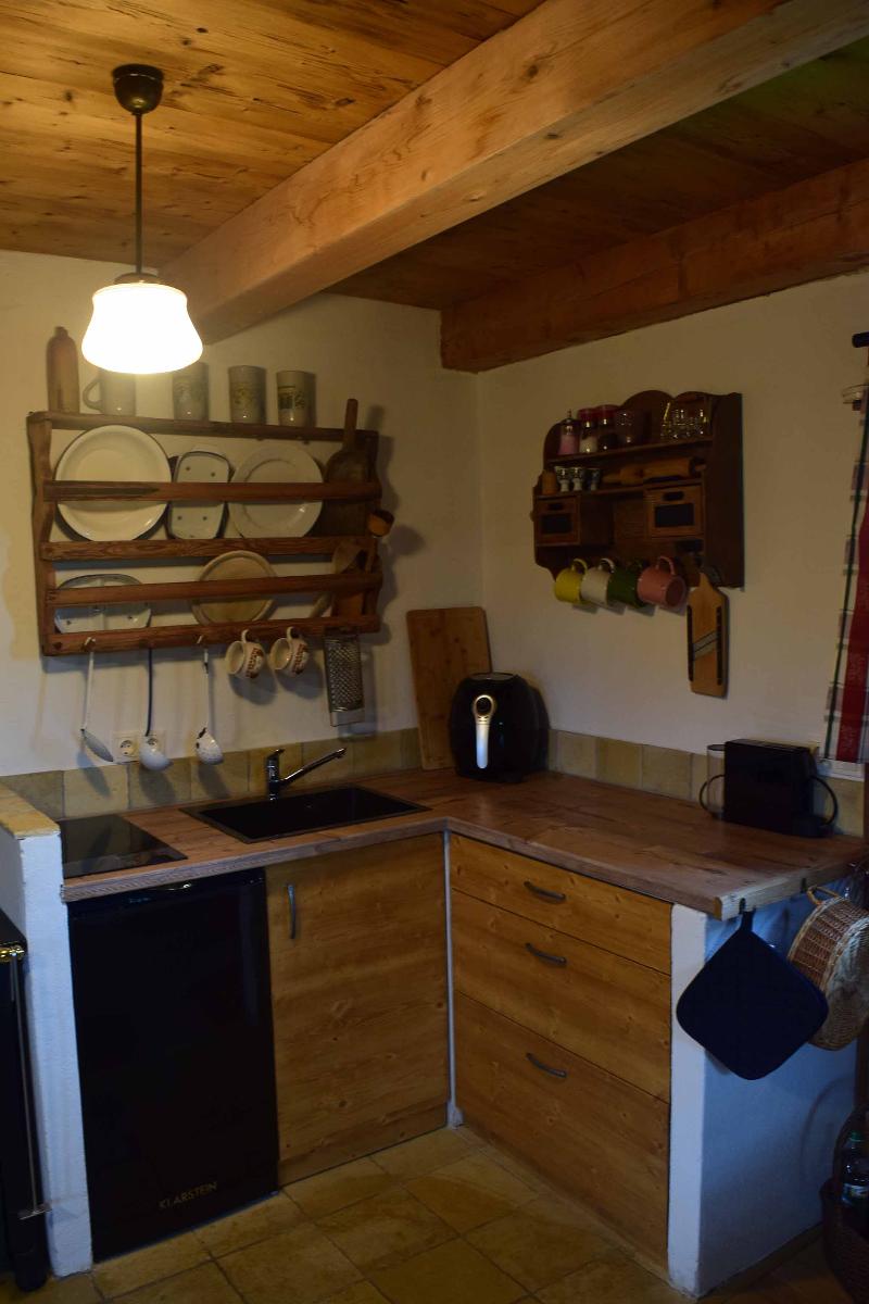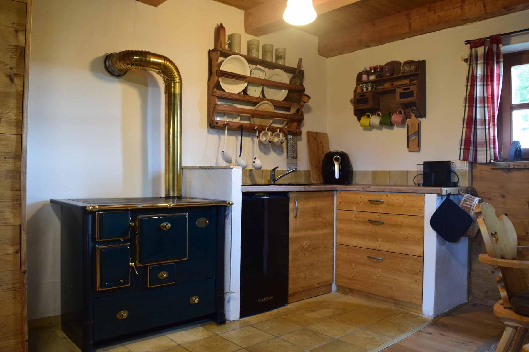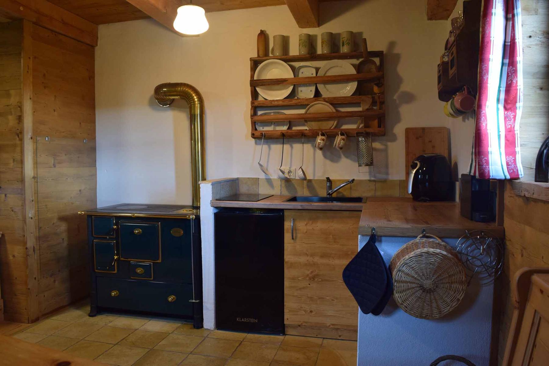 Unser Chalet ist ca. 35 qm groß und bietet Platz für bis zu 3 Personen (davon aber nur maximal 2 Erwachsene). Das Chalet verfügt über eine urig ausgestattete Küche mit nostalgischen Holzofen, einem gemütlichen Wohn- und Essraum sowie einem Schlafzimmer mit Doppelbett. Vom Schlafzimmer aus kommen Sie direkt auf den Balkon.